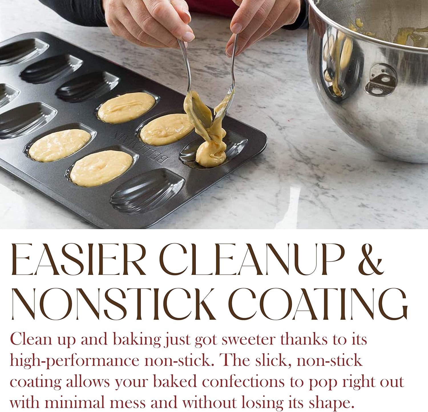 - DODGE THE CLEAN-UP: Unlike plastic or non-finished metals, Bellemain engineered our madeleine pan to make your life easier. With 100% food-safe non-stick coating for easy release and clean-up, you’ll be able to grab the cookies and go, with fewer dishes!