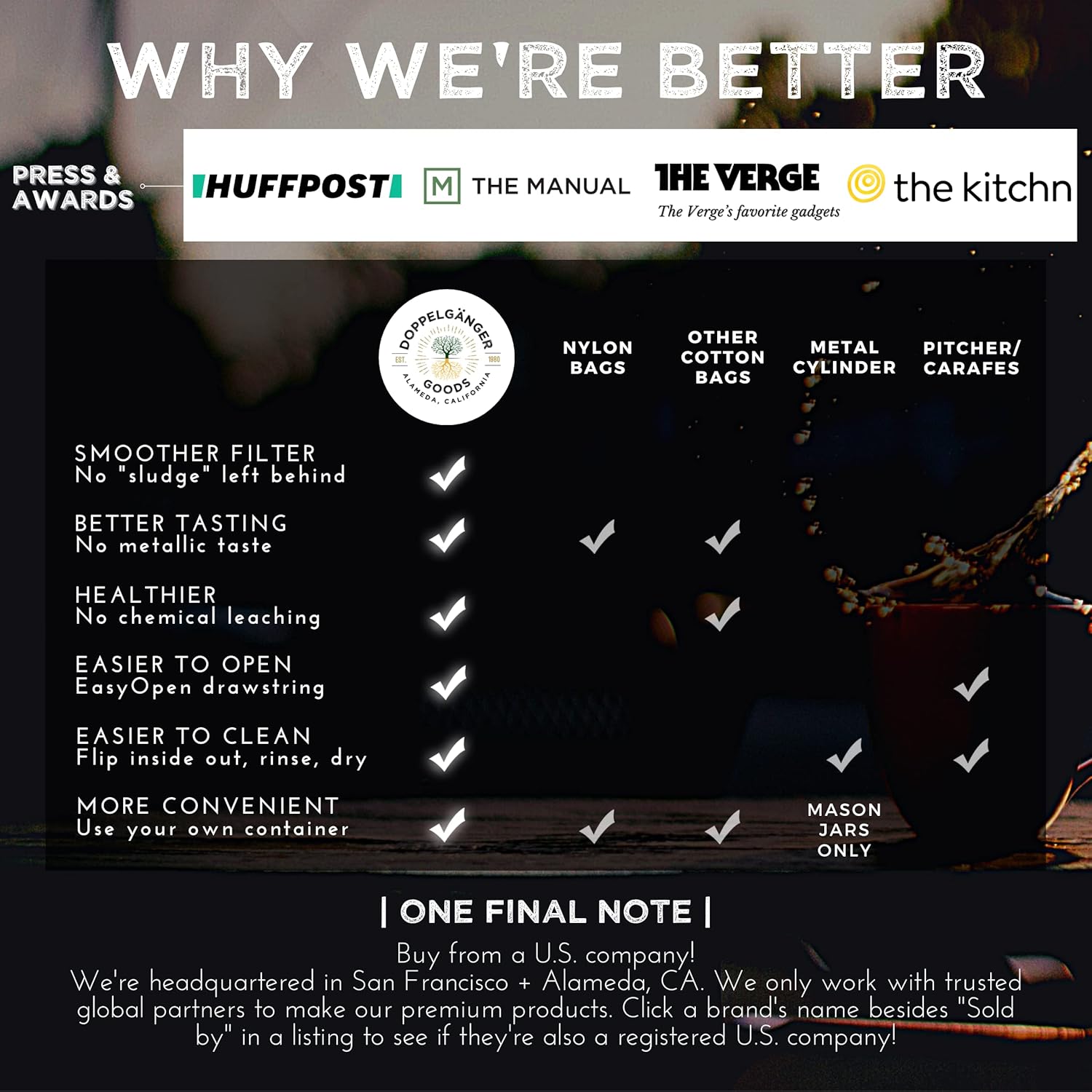 (2-Pack, Large 12in x 12in) Organic Cotton Cold Brew Coffee Bag - Designed in California - Reusable Coffee Filter with EasyOpen Drawstring Cold Brew Maker for Pitchers, Mason Jars, & Toddy Systems