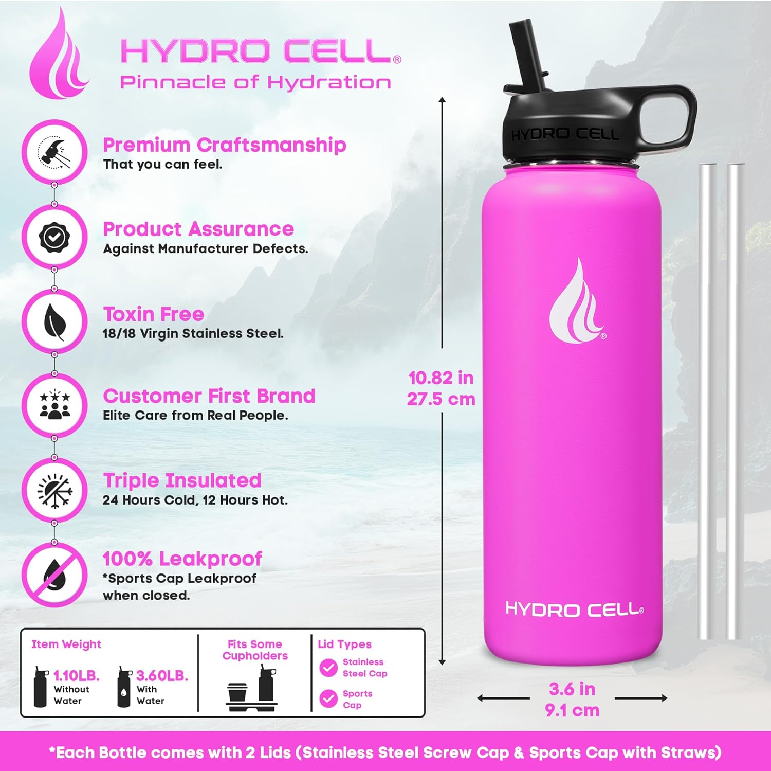 - STYLE: Purchase Includes Stainless Steel Bottle, Screw Cap (100% Airtight), Bonus Sports Cap with Straws (Cold Temp ONLY). Hydro Cell offers the largest selection of matching Paracord Handles, Bottle Boots, and Color Replacement Caps: Sold Separate, Linked Below. Customize your Hydro.
