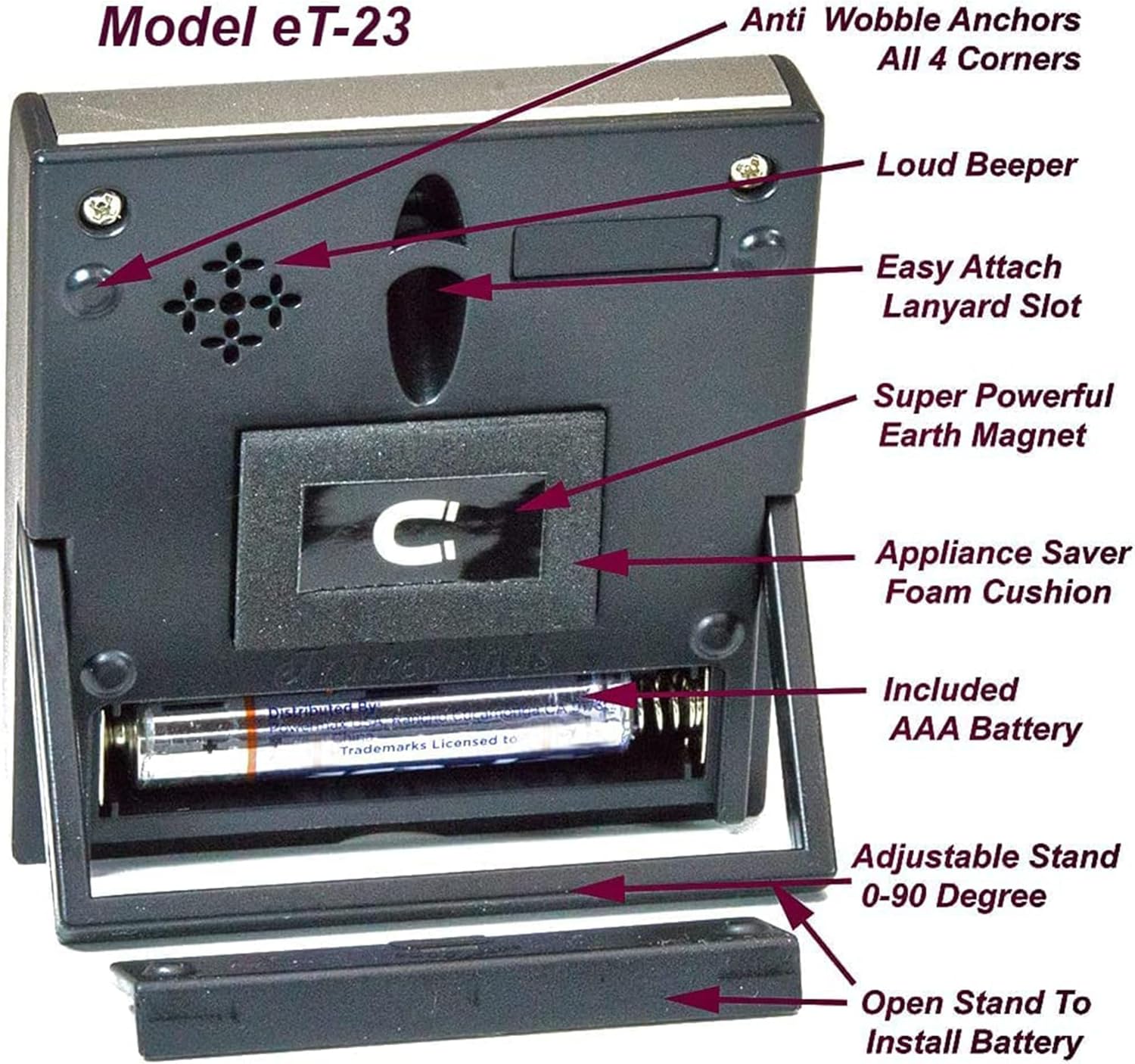 - Strongest Timer Magnet Listed Anywhere: Powerful Neodymium earth magnet & anti-scratch appliance saver foam. Our timers won't slide down your fridge or scratch appliances. Anti-Wobble Stabilizing Anchor Points: Designed on all 4 corners eliminating wobble, pivot, or movement when buttons are pressed while magnet secured. What good is a timer you can’t use while attached? This timer won't pop off your range hood and backflip into your boiling soup because you hit the off button. "No soup fer yu"