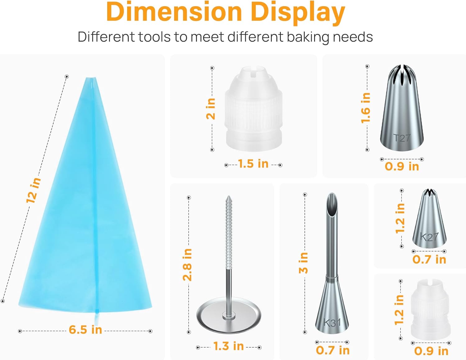 - All-in-one Design: 35 small piping tips, 13 large icing sets, 2 reusable pastry bags, 1 big coupler, 2 small couplers and 1 flower nail decoration kits are helps you create beautiful patterns.
