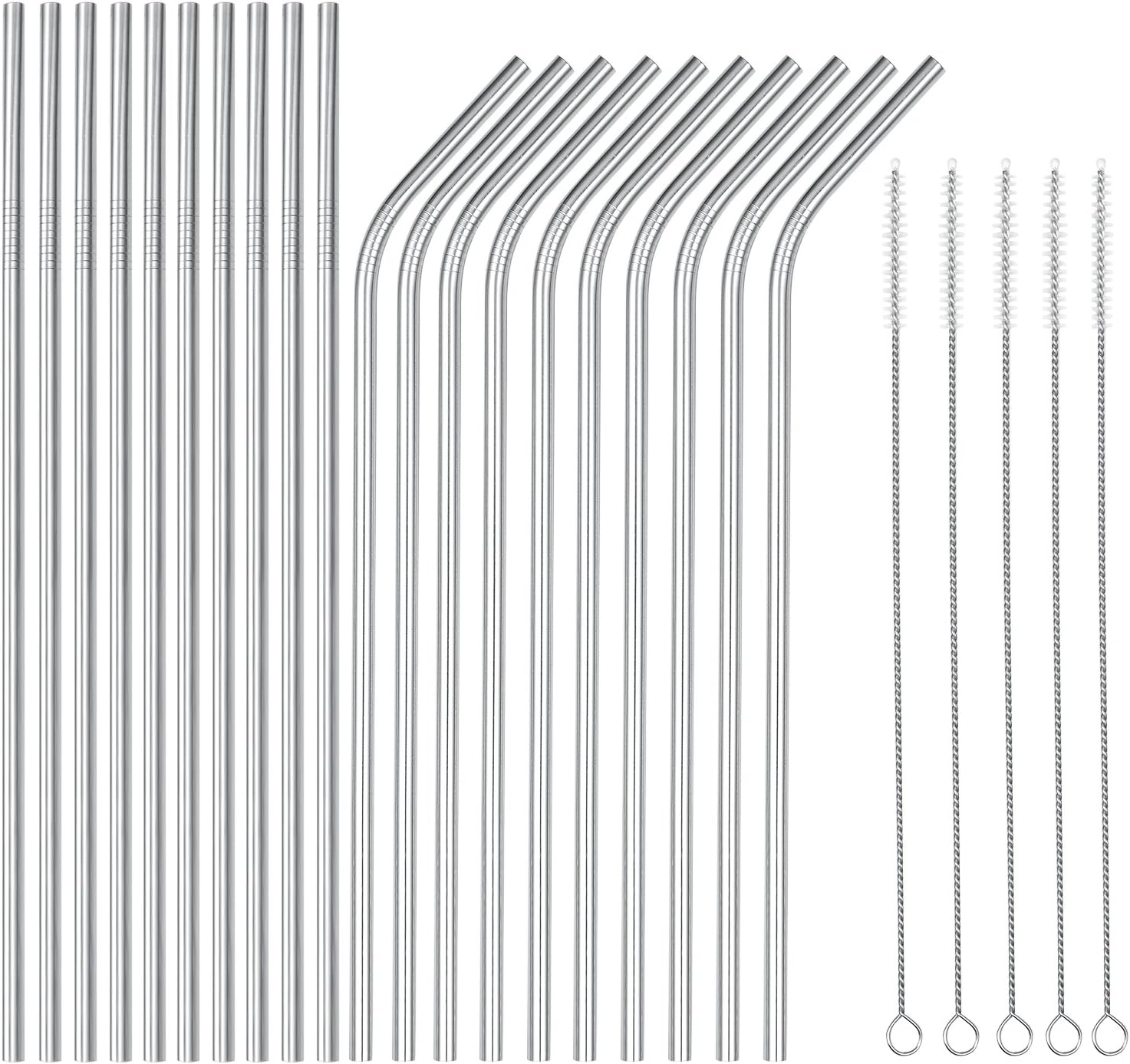 wholesale 25 Piece Set Stainless Steel Straws Long 8.5 Inch Drinking Metal Straws Reusable Drinking Straws for 20 OZ (10 Straight | 10 Bent | 5 Brushes)