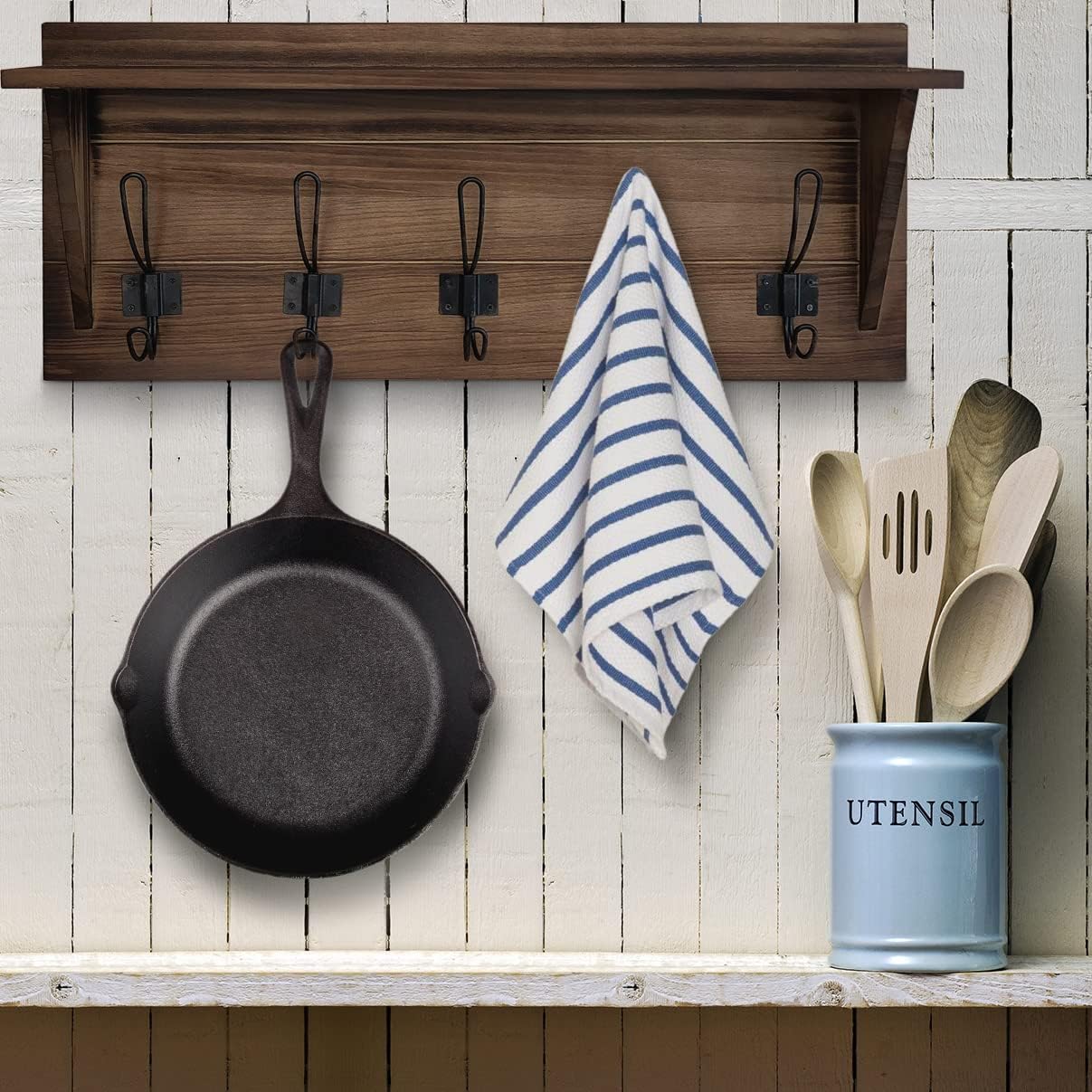- The 24" length is ideal for all areas. The 5 sturdy hooks and flat 3.75 inch shelf makes this rack perfect. Add a touch of rustic beauty to your entryway, hallway, kitchen, bedroom or anywhere else. Each coat rack comes with screws and anchors included making ready to hang out right out of the box!