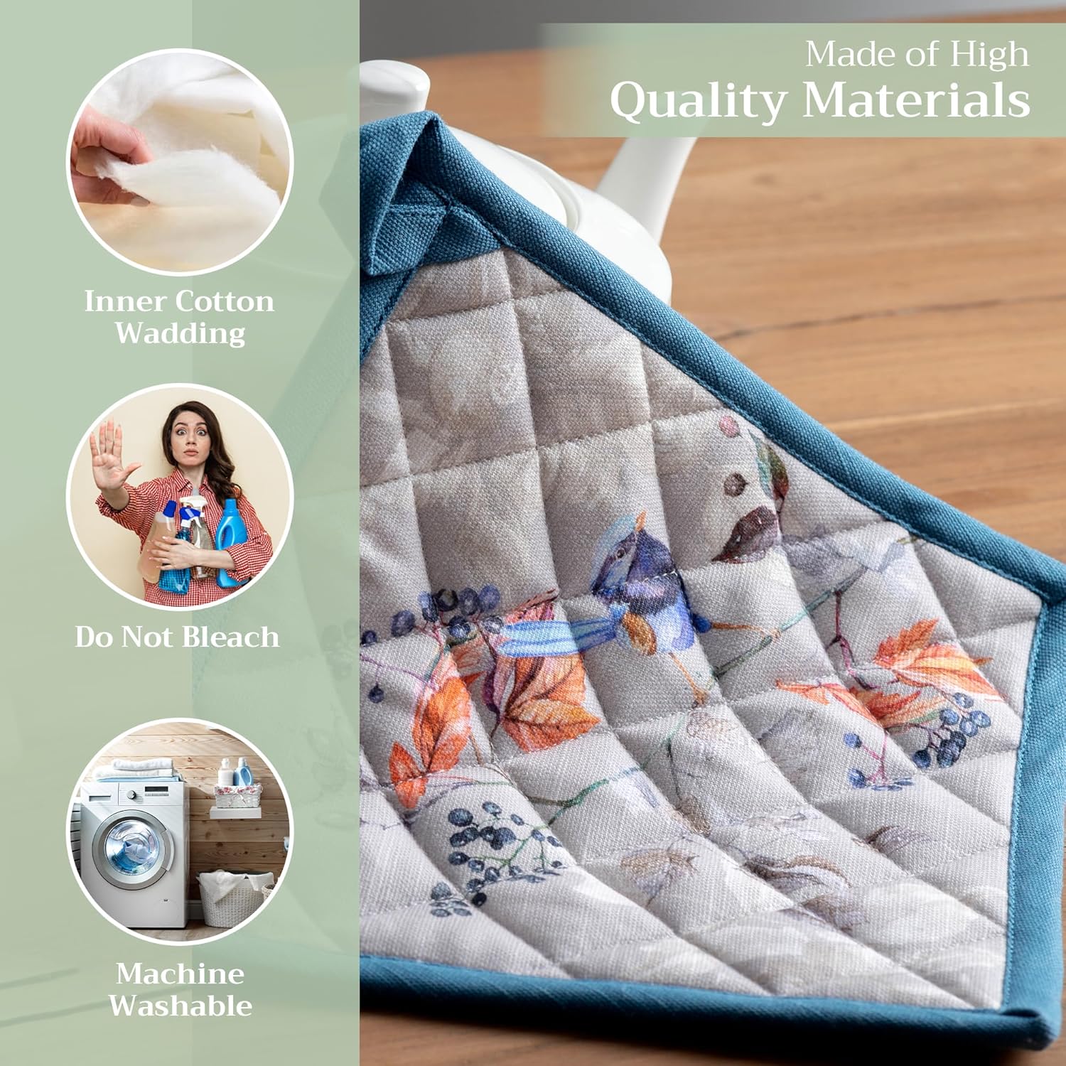 - 100% Quilted cotton: Made from premium quilted cotton, our pot holder ensures safe handling of hot pans or dishes. The soft, durable build provides excellent heat resistance and grip—perfect for everyday cooking and baking needs