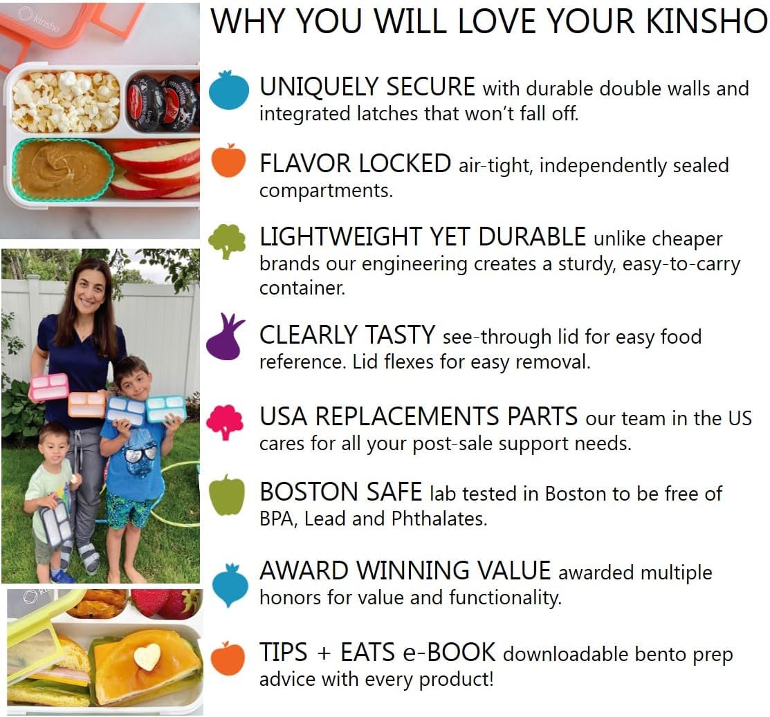 - SEAL is TIGHT. Great for older kids or adults. Young children may need assistance. WHAT YOU GET: *Two authentic Kinsho bentos. *Sporks. *Kinsho Tips + Eats eBook (download) with 60+ Bento tips + recipes from Kinsho’s founder (a mom & award-winning mindful cooking author). *Industry leading guarantee. *Customer support from our Boston-based team.
