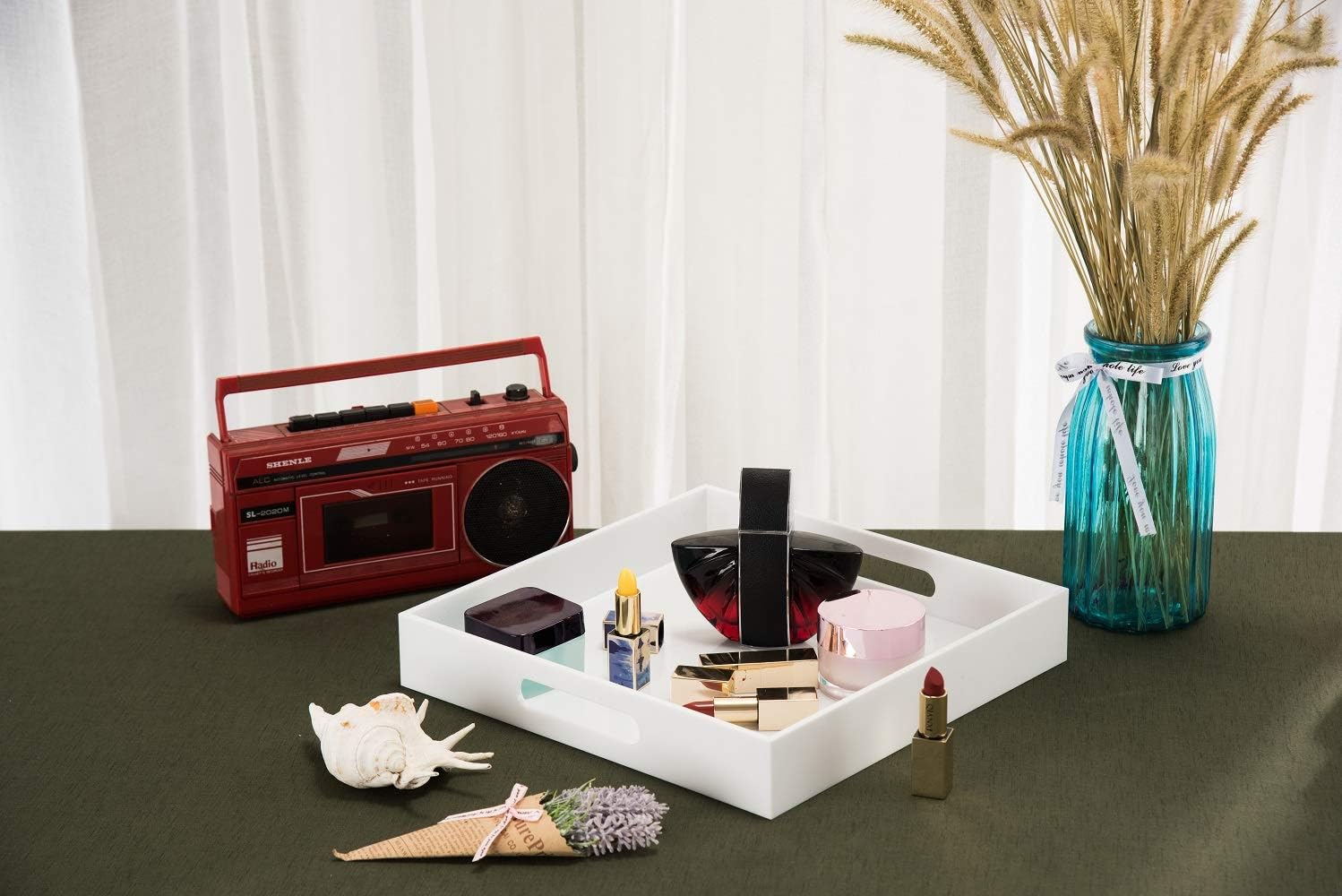 Glossy White Sturdy Acrylic Serving Tray with Handles-10x10Inch-Serving Coffee,Appetizer,Breakfast,Butler-Kitchen Countertop-Makeup Drawer Organizer-Vanity Table,Ottoman Tray-Decorative Tray