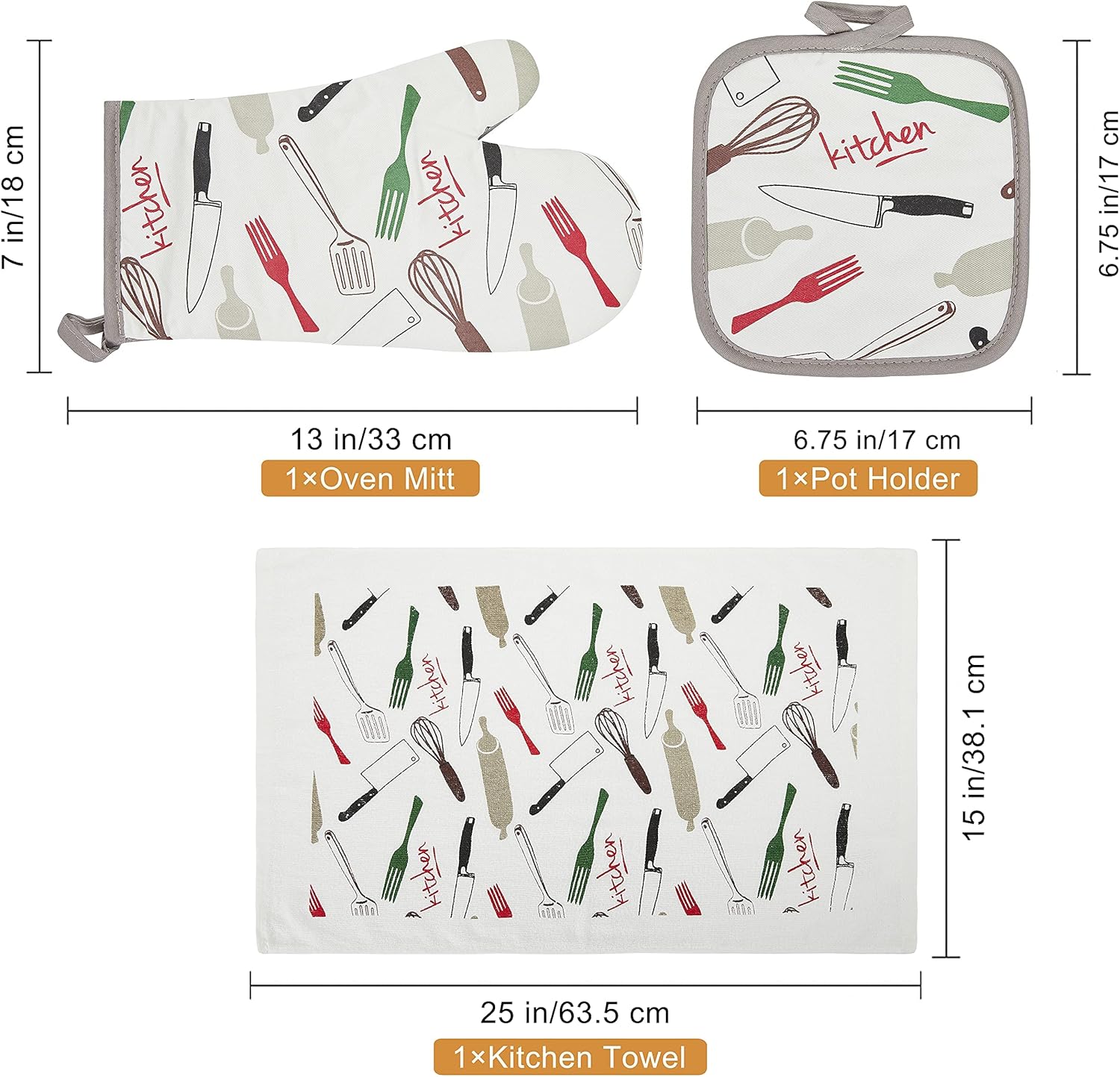 - 【Decorative Designs and Functional】- These kitchen Set feature a variety of fun and colorful prints to complement your kitchen decor. These beautifully Designed and Packaged Value Kitchen sets perfect for Mother's day, birthday, holidays, housewarming and hostess gifts. We also offer a multiple combo and value packs in the same design which are ideal for gifting.