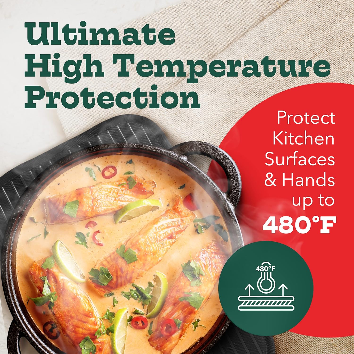 - Designed for easy handling of hot pans, baking sheets, and oven racks. For open flame or broiling, additional protective covering is recommended. These essential kitchen pot holders protect your hands from temperatures up to 480°F.
