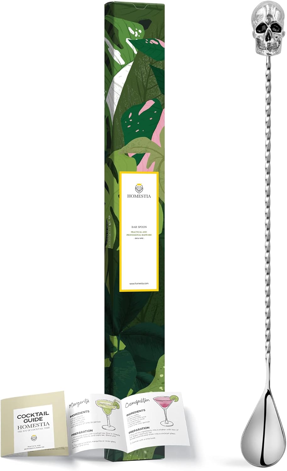Homestia Bar Spoon Cocktail Mixing Spoon, 12-Inches Long Handle Stainless Steel Cocktail Stirrers, Spiral Design with Skull End Cocktail Spoon for Bartender Drinks, Home Use, Halloween Party
