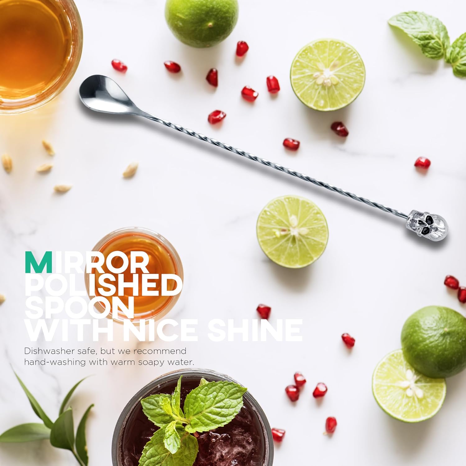 - OPERATION: The zinc alloy skull decoration on the top of the spoon adds a unique and charming style to your bar tools, and a spiral shaped rod in the middle for better control and grip, designed to spin effortlessly. Perfect for stirring drinks, mixing cocktails, juices, smoothies or milkshakes.