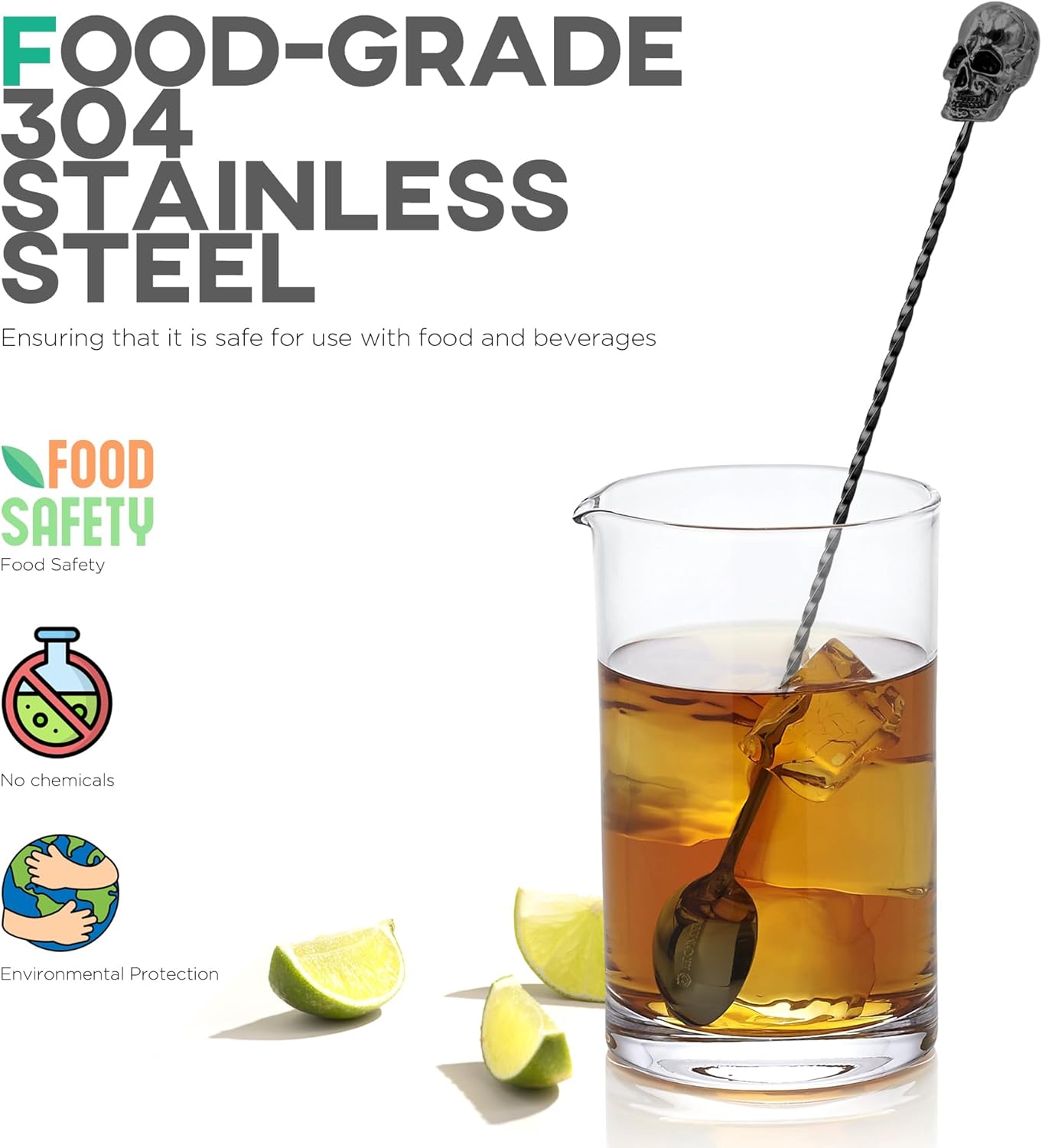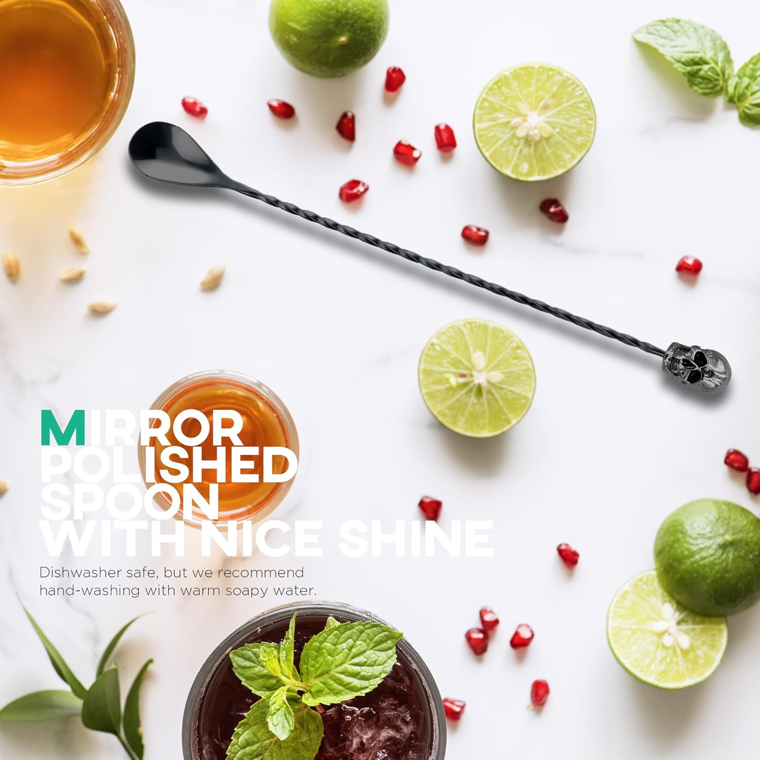 - OPERATION: The zinc alloy skull decoration on the top of the spoon adds a unique and charming style to your bar tools, and a spiral shaped rod in the middle for better control and grip, designed to spin effortlessly. Perfect for stirring drinks, mixing cocktails, juices, smoothies or milkshakes.