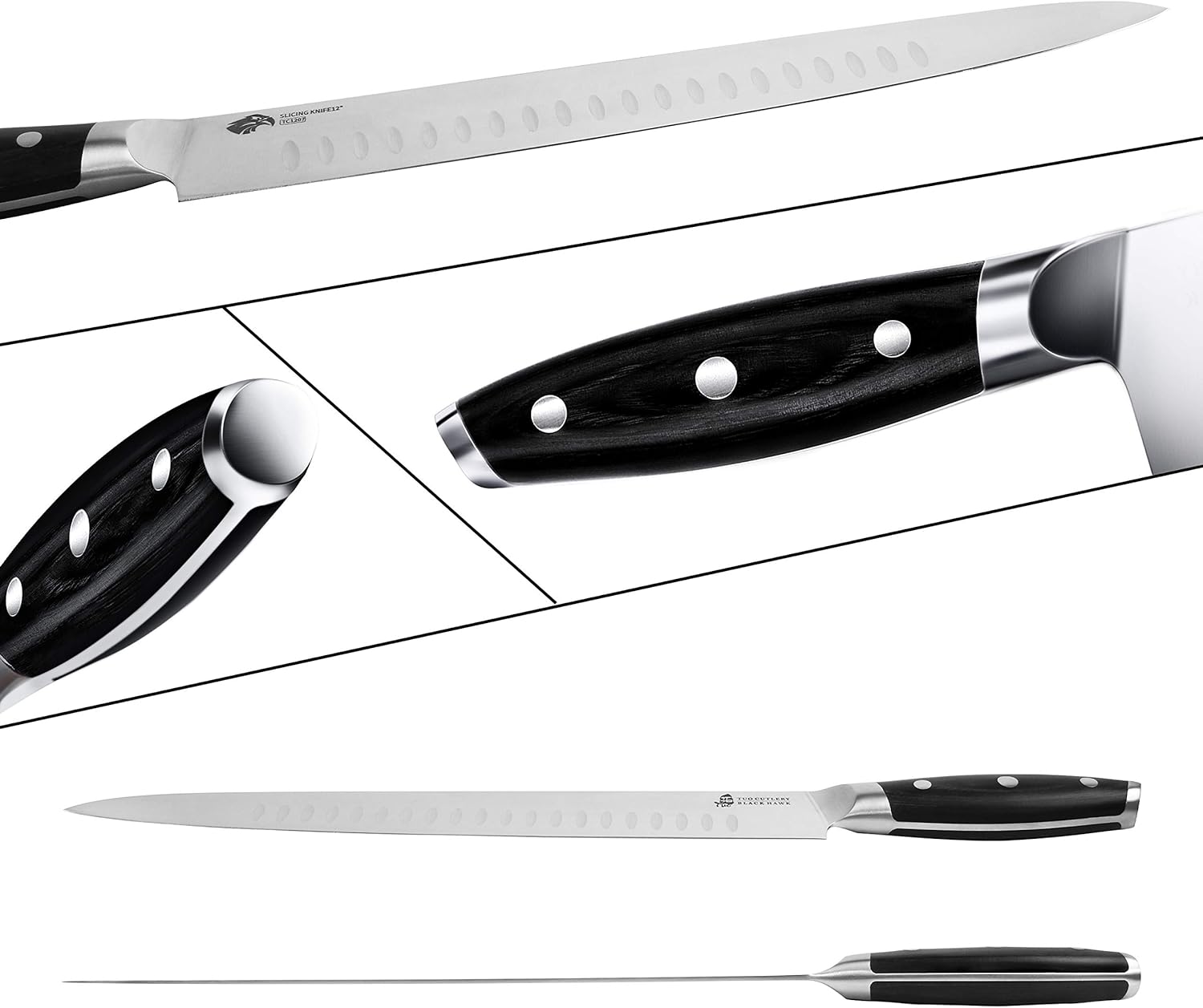 - PERFECTED SLICING KNIFE:The Black Hawk Series, featuring a narrow blade which provides for nimble movement, is designed to be a combination of simple beauty and practical functionality. Featuring German stainless steel with a precise vacuum heat-treatment and nitrogen cryogenic tempering, it ensures you the superb hardness, flexibility, and lasting performance.