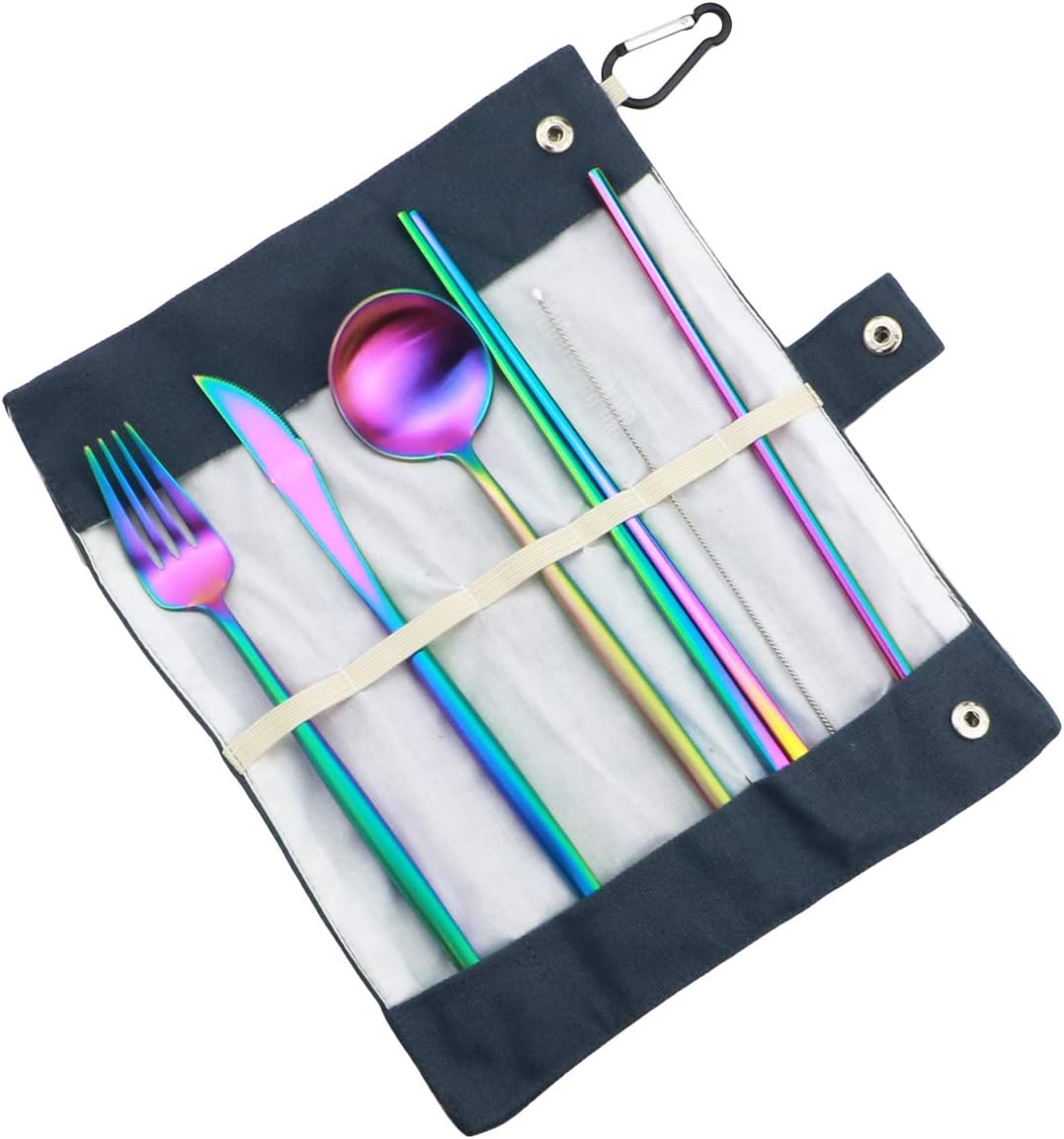 - Perfect Size & 7-Piece Travel Flatware Set Includes - Dinner knife, dinner fork, dinner spoon, chopsticks, cleaning brush, straight straw, carrying case. Suitable for travel, camping, school, flight or workplace.The cutlery is compete in size and light in weight, making it easy to carry around. The 7-piece portable Silverware set is a must-have for daily use, camping, and home travel.