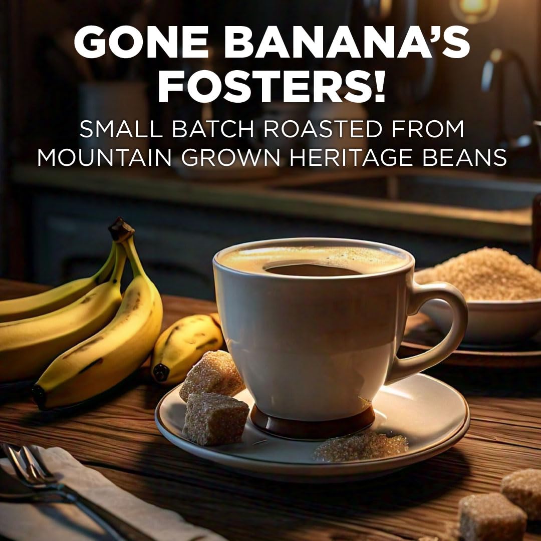 - [Flavorful Banana Foster Blend]: Maud's "Gone Banana Foster" Coffee Pods pair the sweet and subtle notes of banana cream and vanilla ice cream in this medium roast flavored coffee topped with buttery brown sugar, cinnamon and dark rum. Banana bread meets its perfect match with our Banana Foster Coffee.