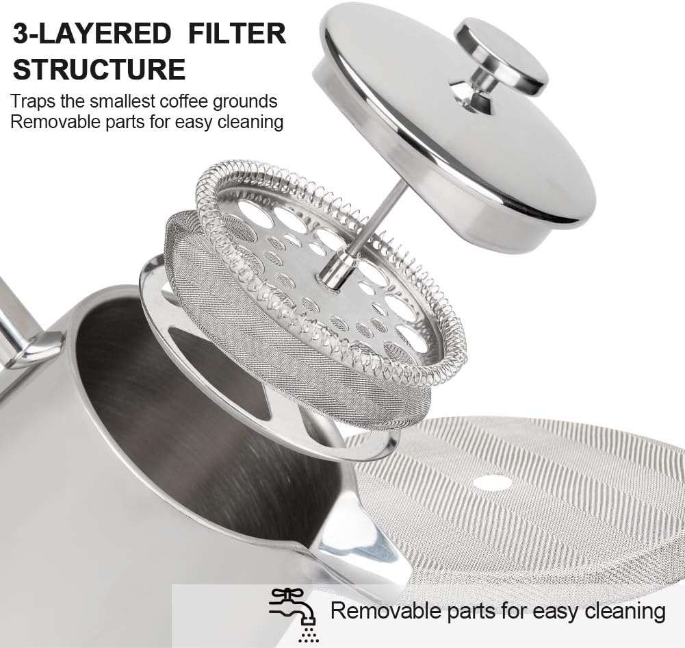 - Stainless Steel Screen included with this French press coffee maker. The filter screen is easy to disassemble and clean. Stack one or more screens together to give your espresso a more refined taste