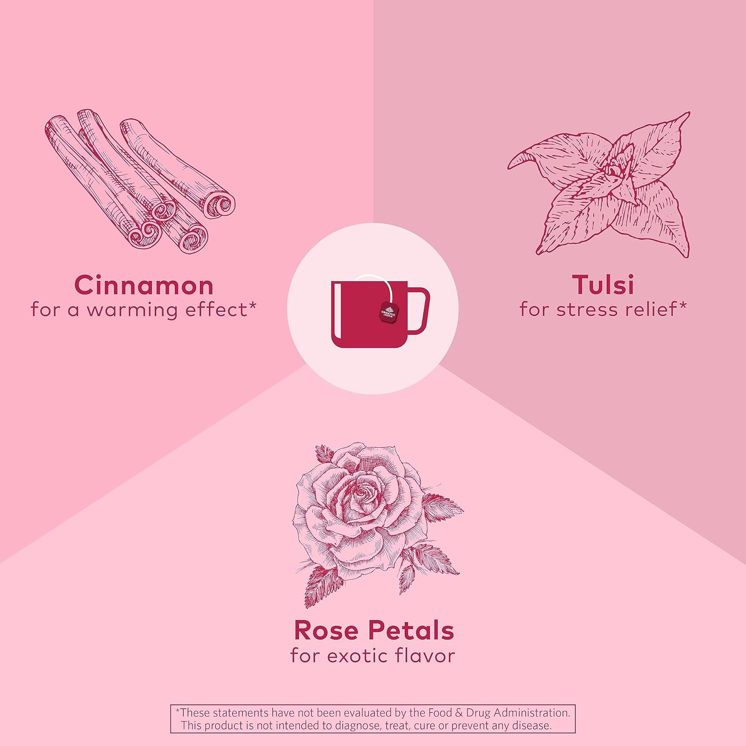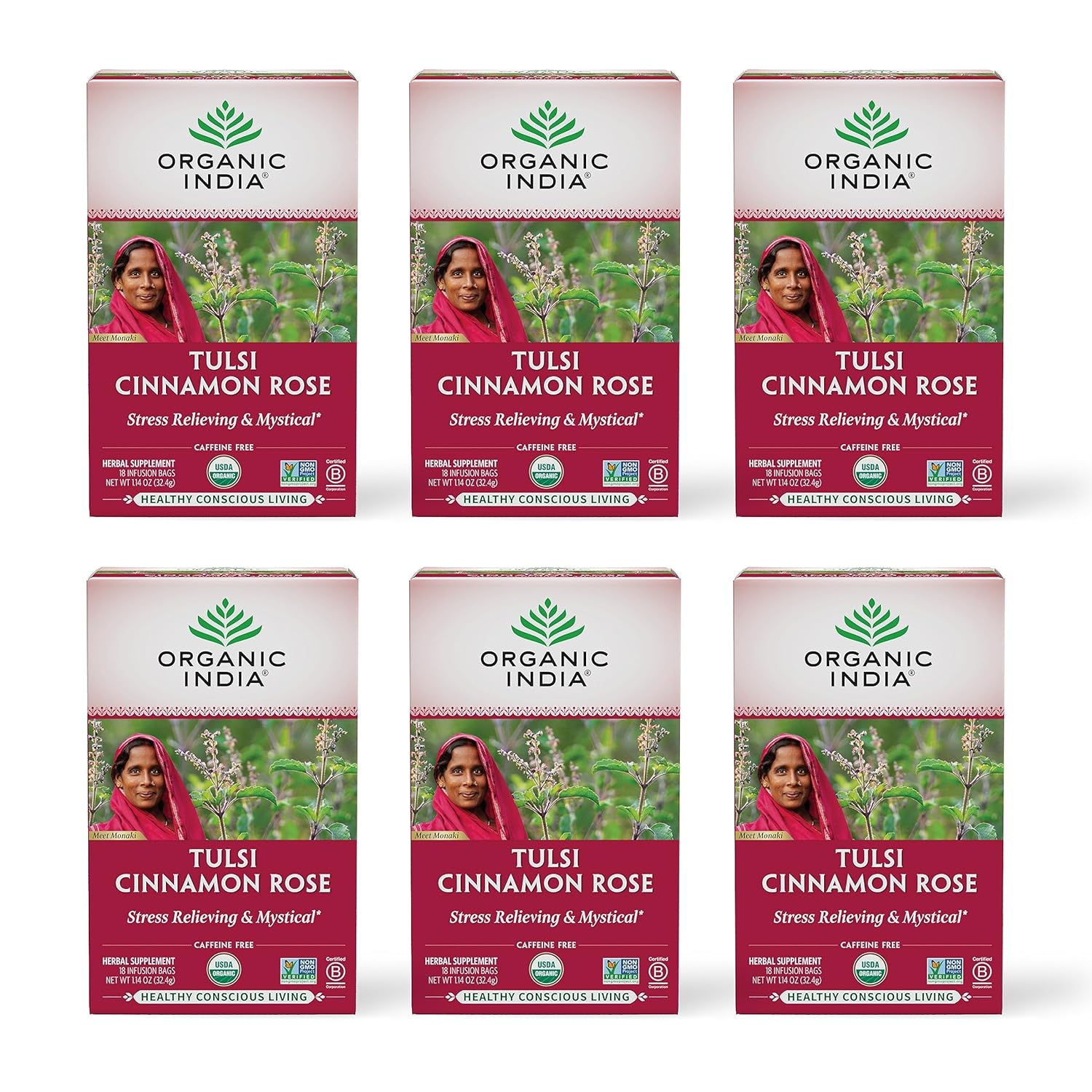 Organic India Tulsi Cinnamon Rose Herbal Tea - Holy Basil, Stress Relieving & Mystical, Immune Support, USDA Certified Organic, Supports Sugar Metabolism, Caffeine-Free - 18 Infusion Bags, 6 Pack