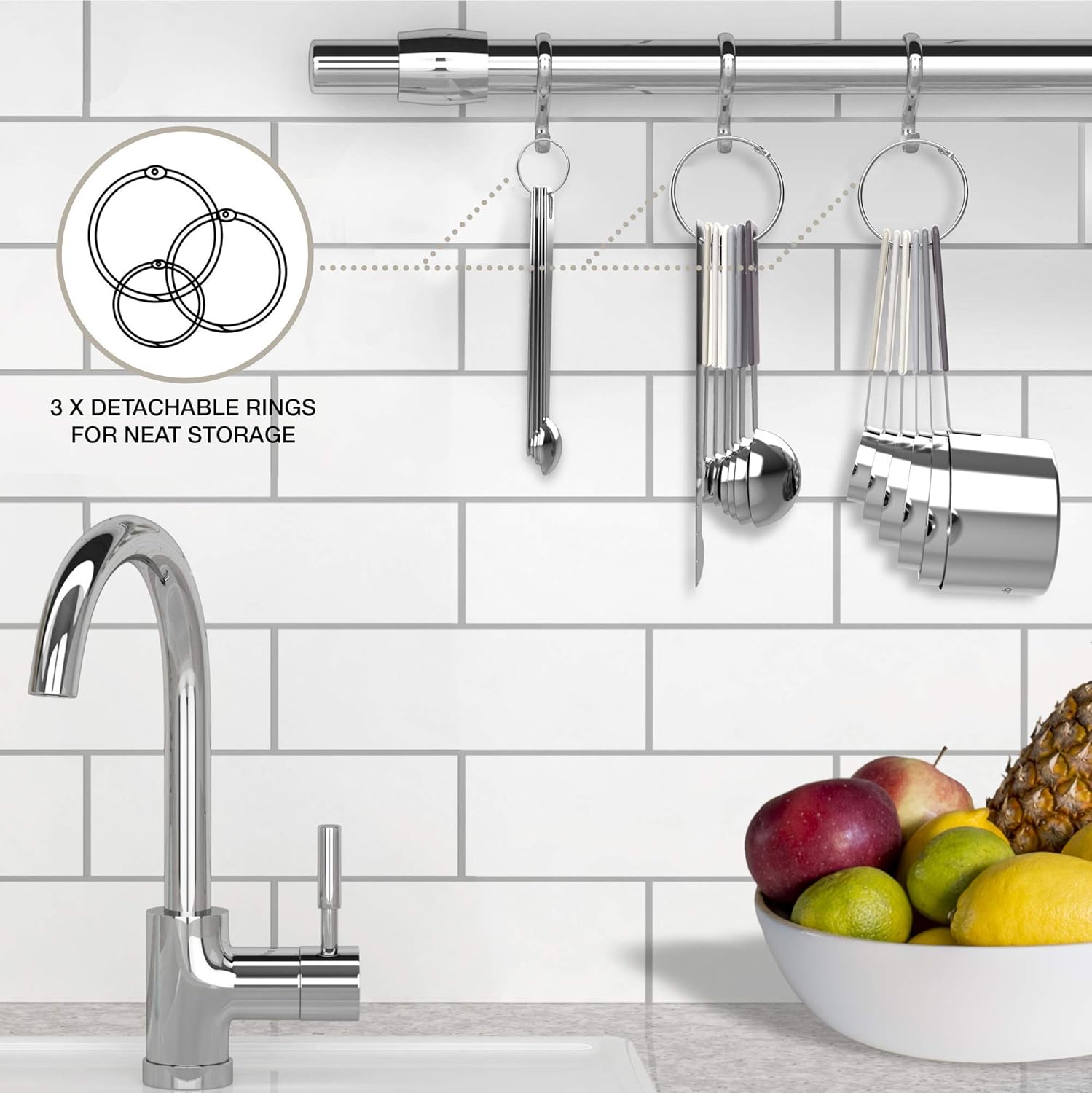 - The only set you will ever need - This versatile set of 22 pieces include: * 6 measuring cups (1/8 cup, 1/4 cup, 1/3 cup, 1/2 cup, 3/4 cup, and 1 cup) * 6 measuring spoons (1/8 tsp, 1/4 tsp, 1/2 tsp, 1 tsp; 1/2 tbsp and 1 tbsp) * 5 mini-measuring spoons (drop, smidgen, pinch, dash, and tad) * 1 cup- or spoon-leveling tool with mini-ruler * 1 fridge-magnet conversion chart * 3 round hinged rings. Whatever measurement you need, we got you covered.