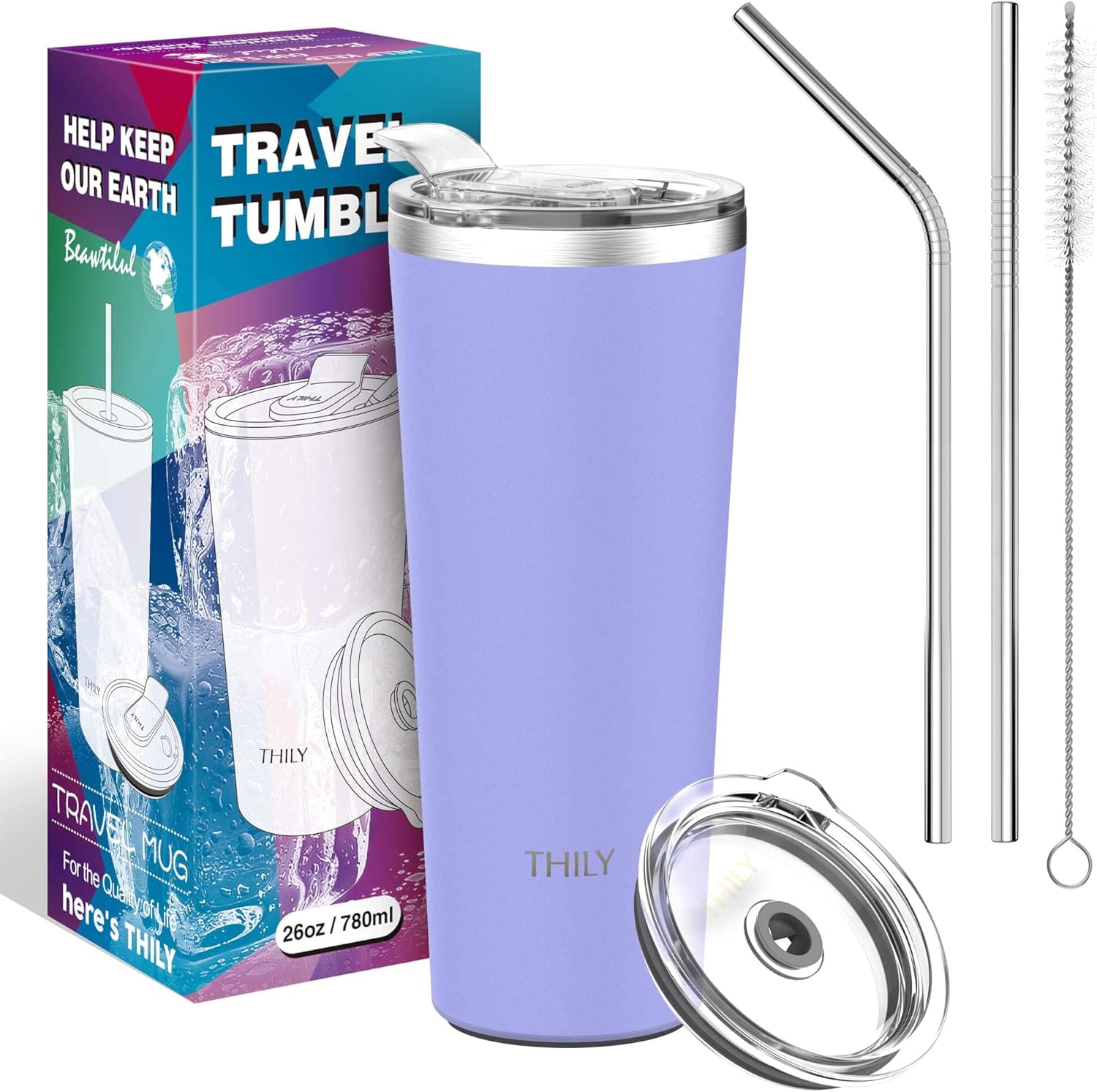 THILY Tumbler Stainless Steel Travel Mug 26 oz Triple-Insulated Coffee Cup with 2 Lids and Straws, Reusable, Powder Coated, Splash-Proof, Keep Ice Drinks Cold, Lavender