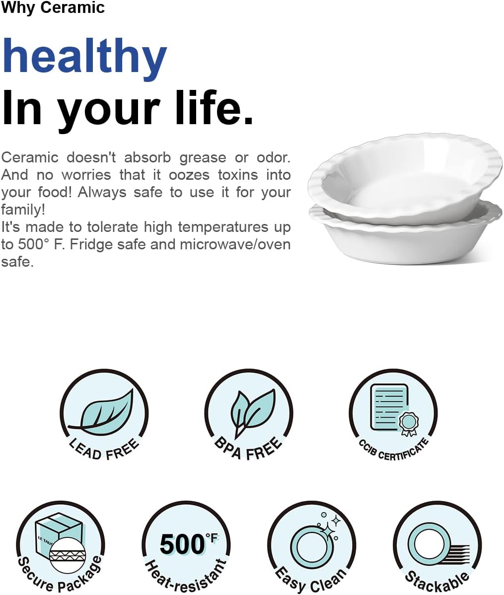 LE TAUCI Ceramic Pie Pans Plate for Baking, 9 inch Deep Dish Baking Dish, 52 ounce Bakeware for Apple Pecan Pie, Set of 2, White