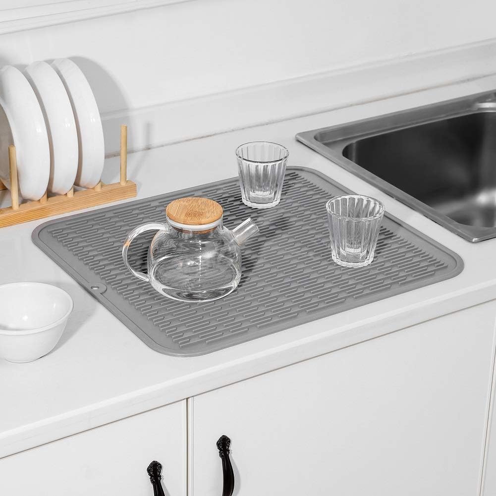 Silicone Dish Drying Mat for Multiple Usage,Easy clean,Eco-friendly,Heat-resistant Silicone Mat for Kitchen Counter or Sink,Refrigerator or Drawer Liner Grey XL 18 inches x 16 inches