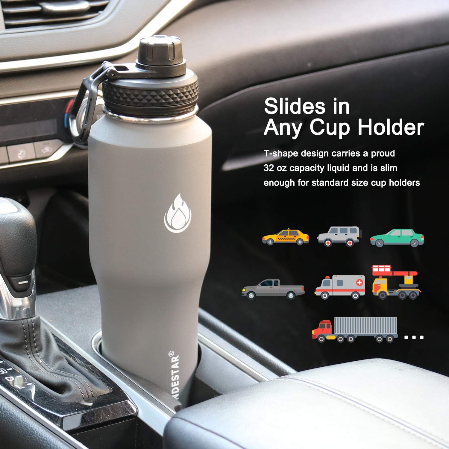 - 【FUNCTIONAL DESIGN】32oz(946ml)insulated water bottle fit any standard car cup holder comes with The non-slip layer of Powder Coating ensures you hang on to your bottle during a work out, hike or yoga.Various colors SENDESTAR is good for people of all ages and perfect companion for all activities.