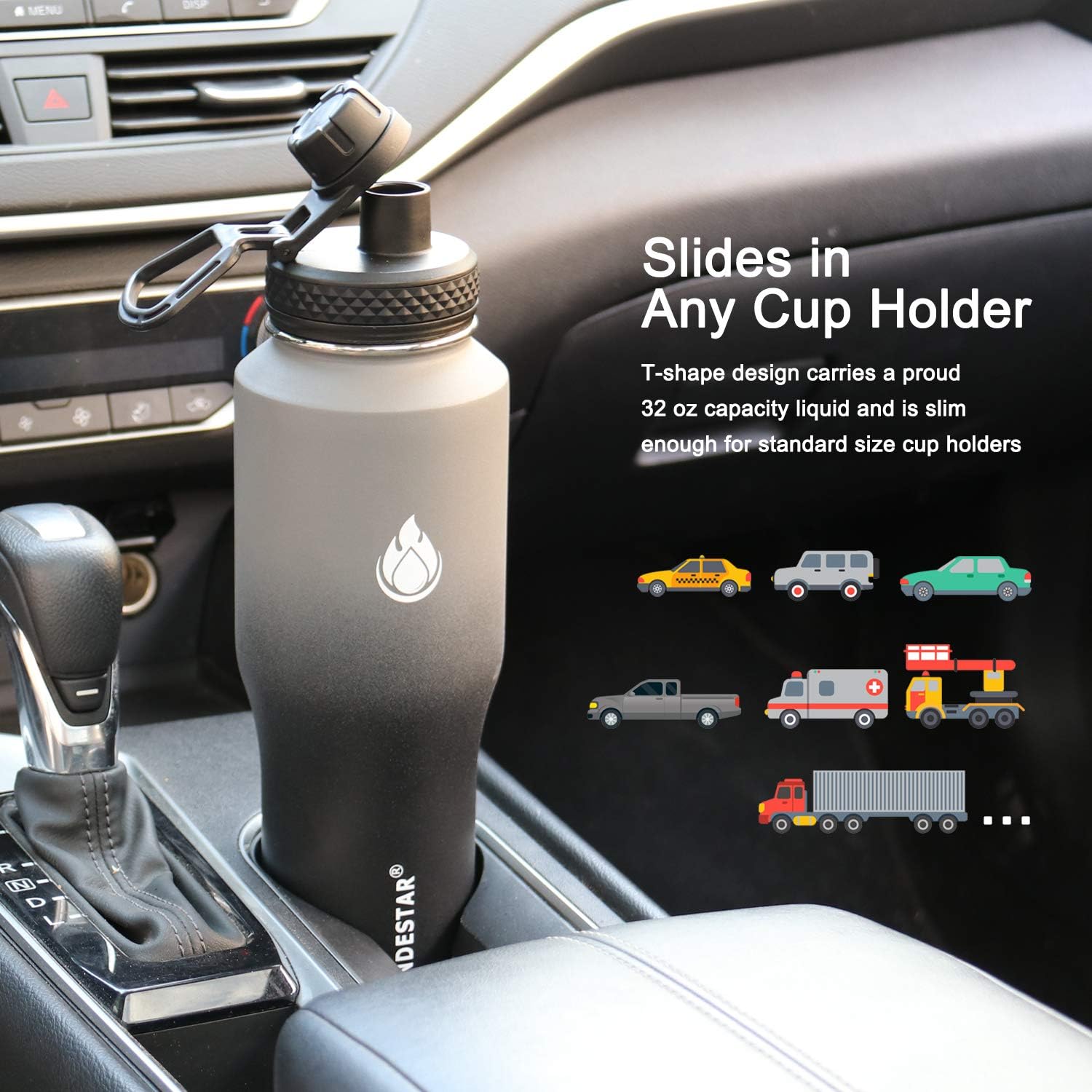 - 【FUNCTIONAL DESIGN】32oz(946ml)insulated water bottle fit any standard car cup holder comes with The non-slip layer of Powder Coating ensures you hang on to your bottle during a work out, hike or yoga.Various colors SENDESTAR is good for people of all ages and perfect companion for all activities.
