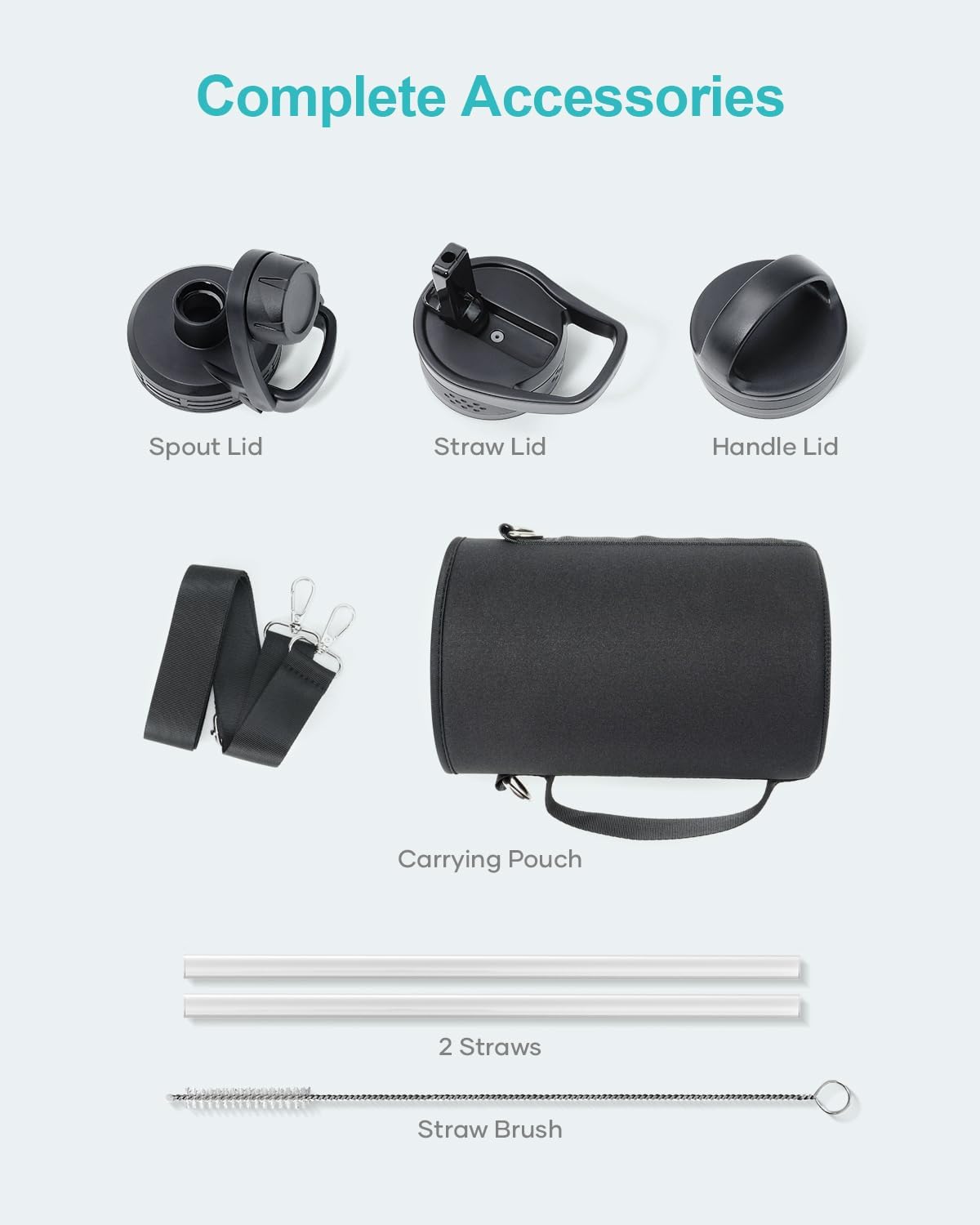 BUZIO 64 oz Water Bottle Insulated with Straw & 3 lid and Carrying Pouch, Leak Proof Half Gallon Stainless Steel Water Flask Jug, Cold for 48 Hrs Double Vacuum Thermo Canteen, BPA-Free, Black