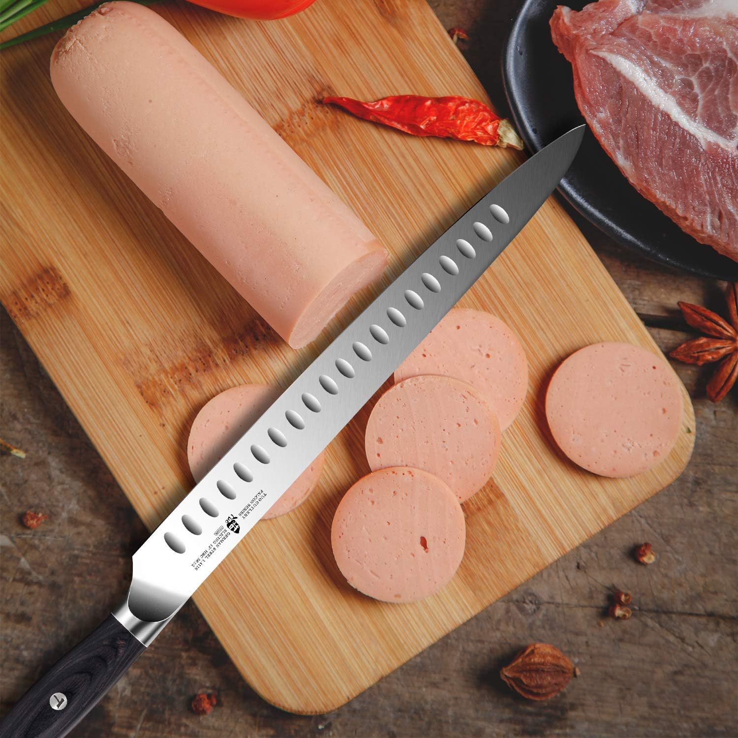 - 🥩【PREMIUM STEEL】Made of premium German high carbon stainless steel, this carving knife have a excellent performance in rust, corrosion and discoloration resistance. If use this knife in a right way, its blade can maintain the state of newness for a long time.