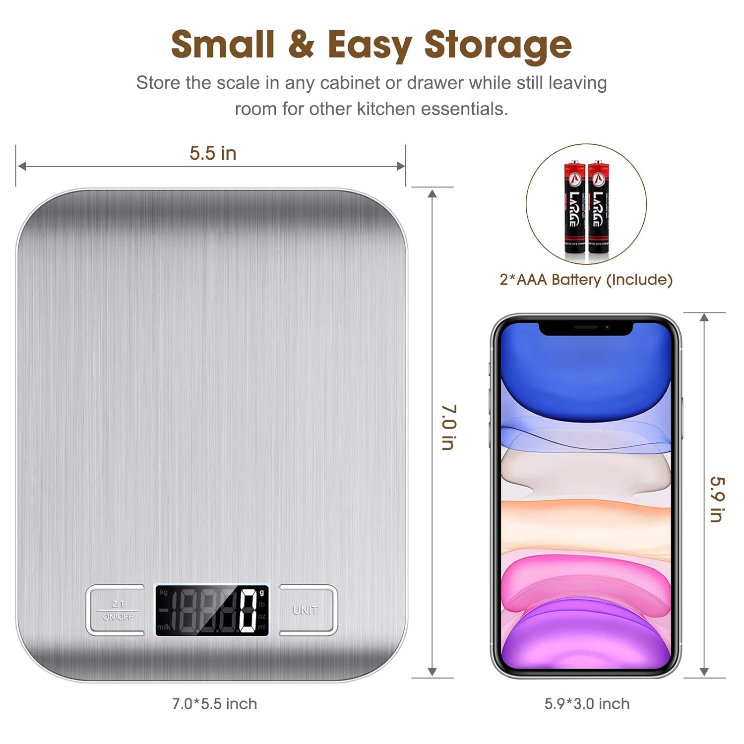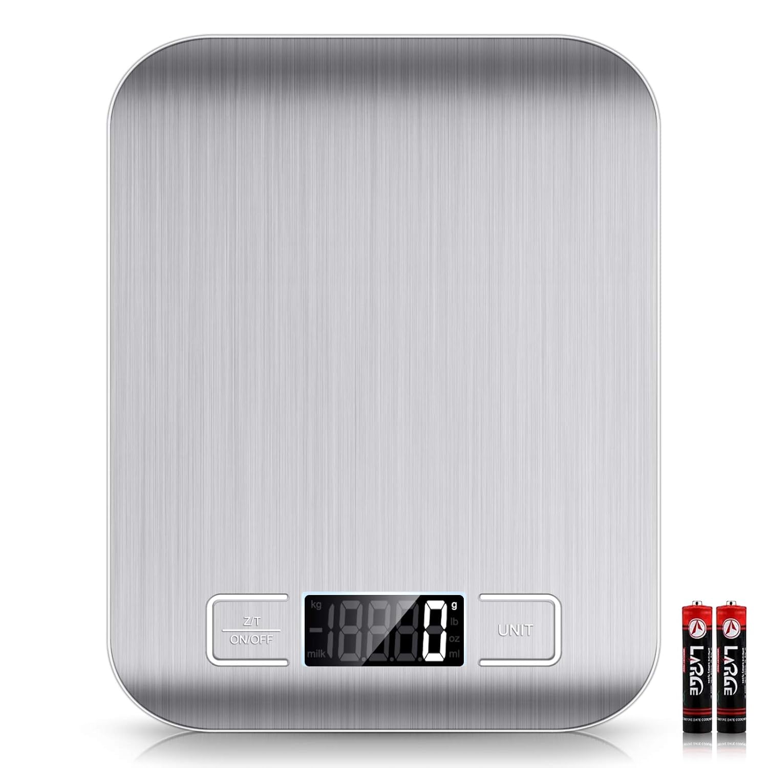 - 【Multifunction Scale】This digital kitchen scale has 6 measurement unit to meet all the food weight that you need: g, kg, lb, oz, ml, milk ml. Big bright LCD display easy to read.
