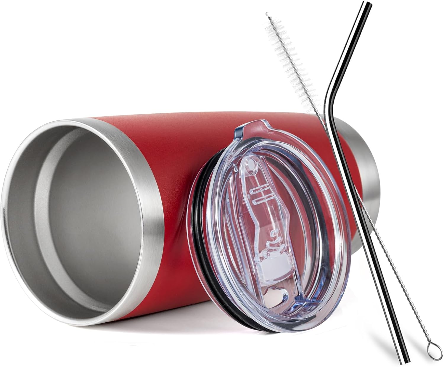 COMOOO 20oz Double Wall Vacuum Insulated Travel Mug, Stainless Steel Tumbler with Lid and Straw Durable Powder Coated Insulated Coffee Cup for Cold & Hot Drinks (Red, 8 PACK)