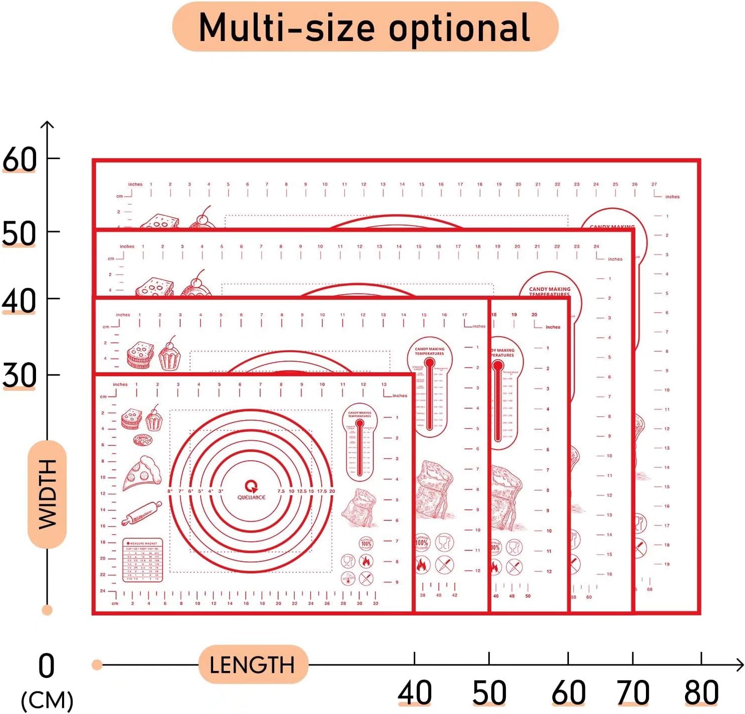 - FOOD GRADE SILICONE: silicone pastry mat made of 100% Food-Grade Silicone, no harm to the body, safe use for temperatures of -45 degrees F (-43 C) to 450 degrees F (230 C), no unpleasant chemical odors, providing you more time to enjoy your creations.