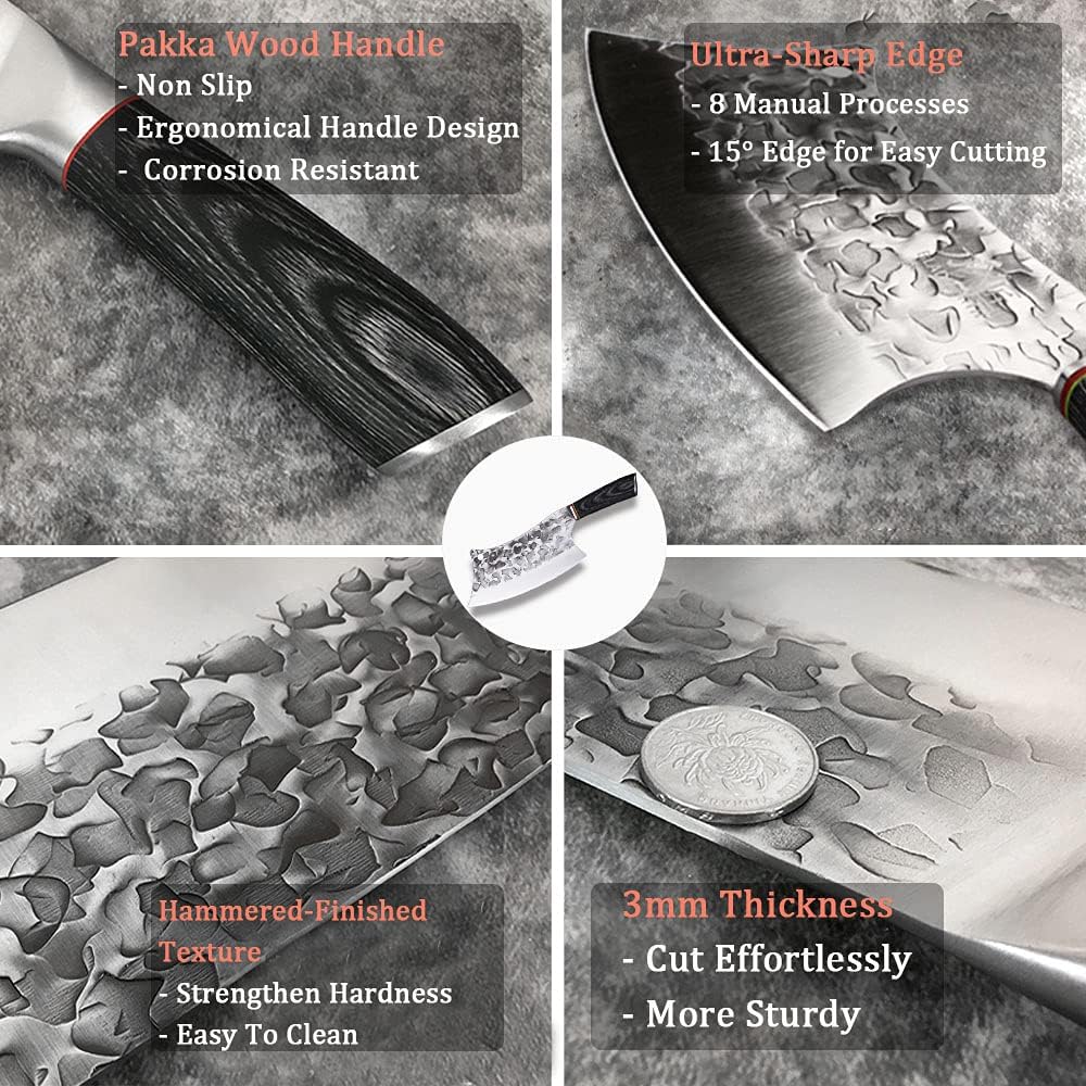 - ① SPECIAL DESIGN - 🅰 First, the SHARP CURVED EDGE our chopper knife can help do rocking motion easily. And the front edge does not need to leave the cutting board. So, it will be very effortless. 🅱 Second, the BROAD BLADE can help scoop and transfer the chopped food easily. 🅲 Third, The Fire Lightning Texture on the blade helps prevent meat or vegetable from sticking to the blade. ✅ Definitely, it is a perfect kitchen prep knife and butcher knife for meat cutting.