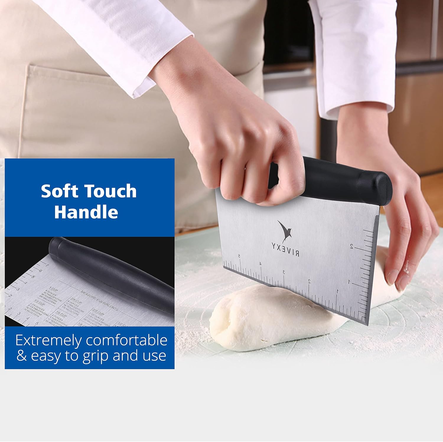 - ๐๐ซ๐ ๐จ๐ง๐จ๐ฆ๐ข๐ ๐๐๐ง๐๐ฅ๐: Rivexy bench scraper kitchen tool features a non-slip ergonomic handle that provides a firm grip, ensuring comfort and control during extended use, making it ideal for both kitchen prep and griddle cleaning.