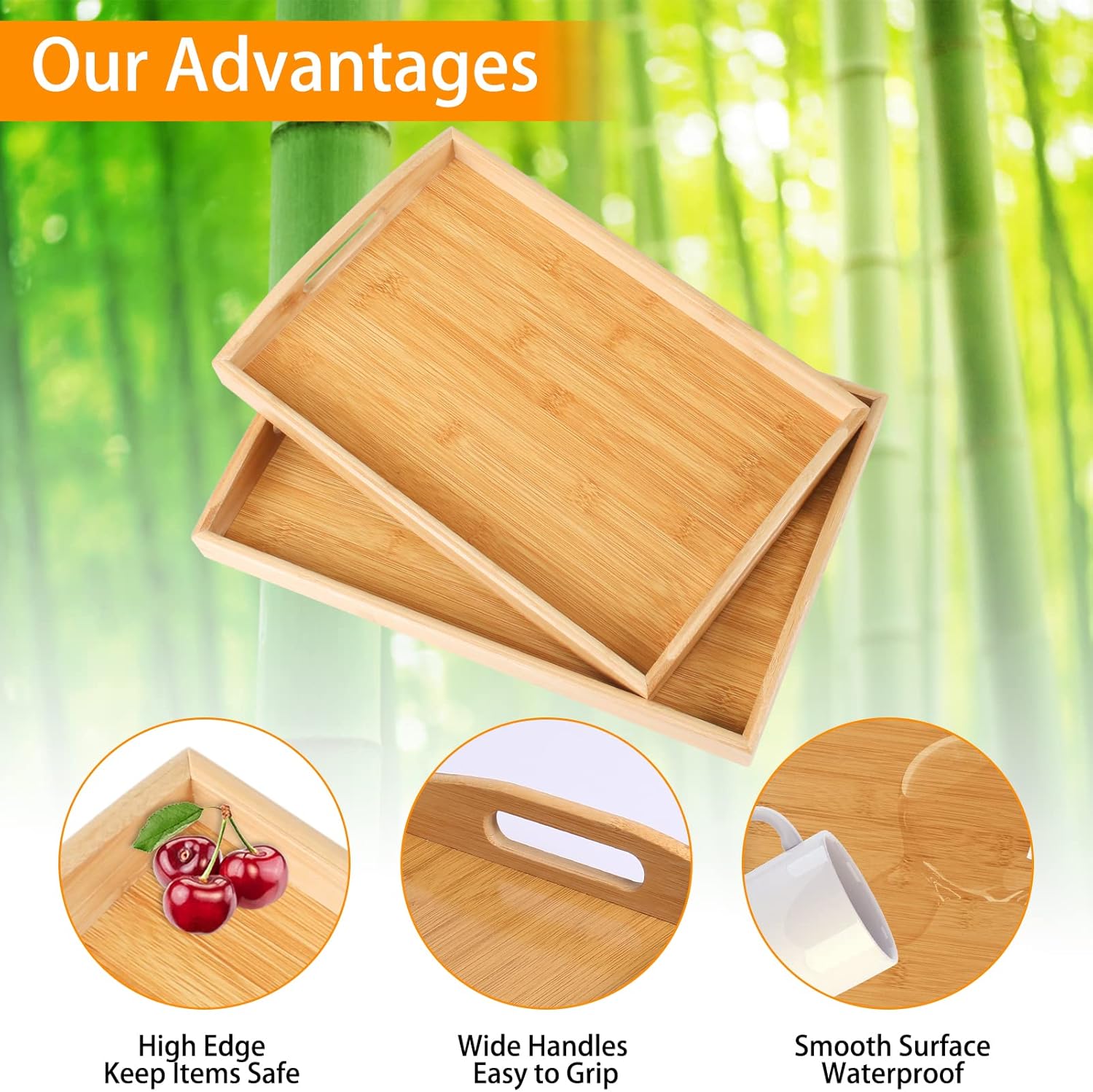 - 🌲🌲Ergonomic Grip Handles: It's elegant sides with wide handles design makes it more easy to grip and transport, allow for easy carrying of food from the kitchen to living room, patio, bedroom or bathroom; raised edge could prevent items from falling over, never worry about accidents.