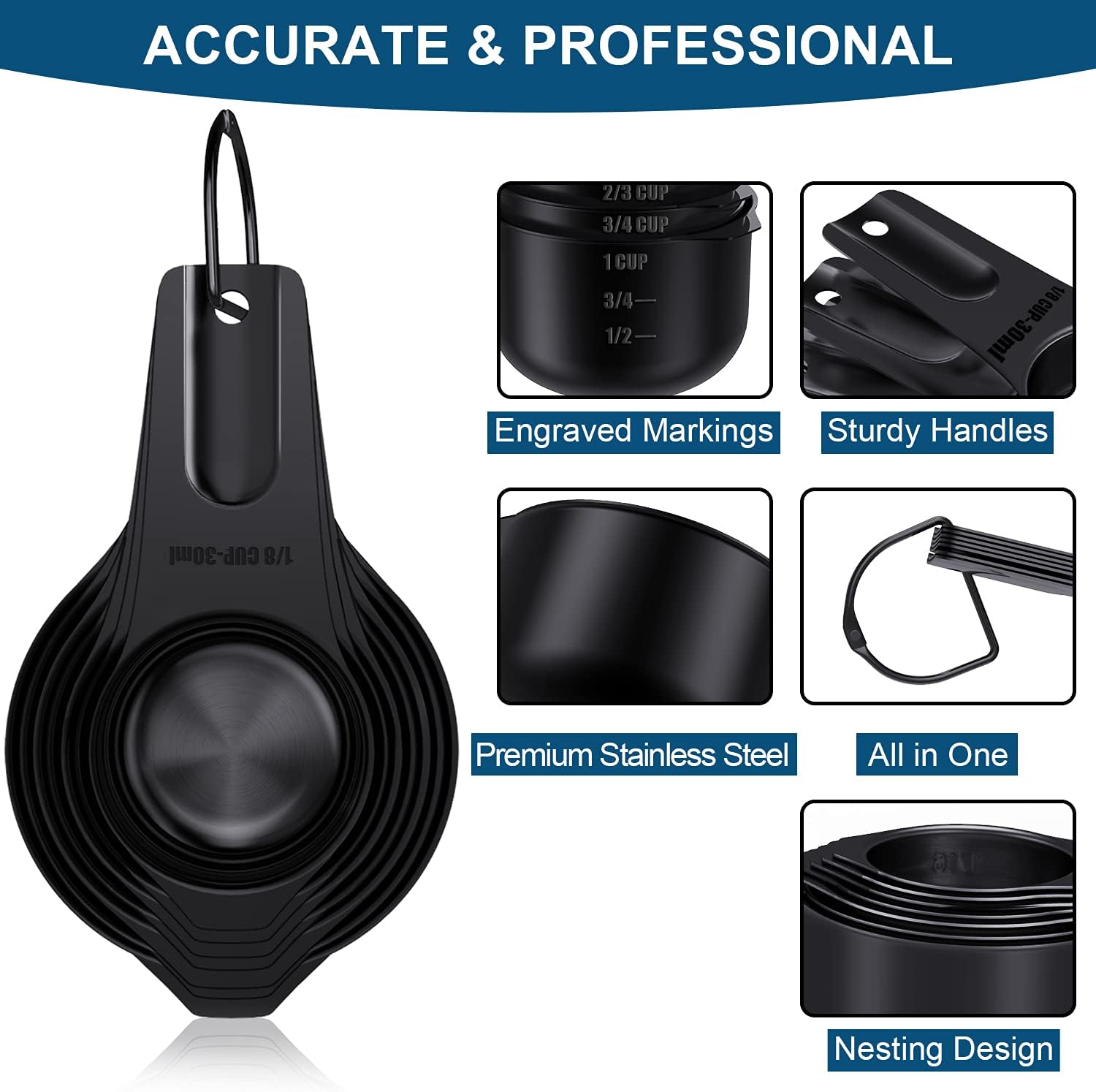 - EASY TO STORE: The measuring cups each stacked in one bundle with a removable stainless ring which makes them easy to store in the cabinet or hang on wall, and you can easily take apart to use them when you need