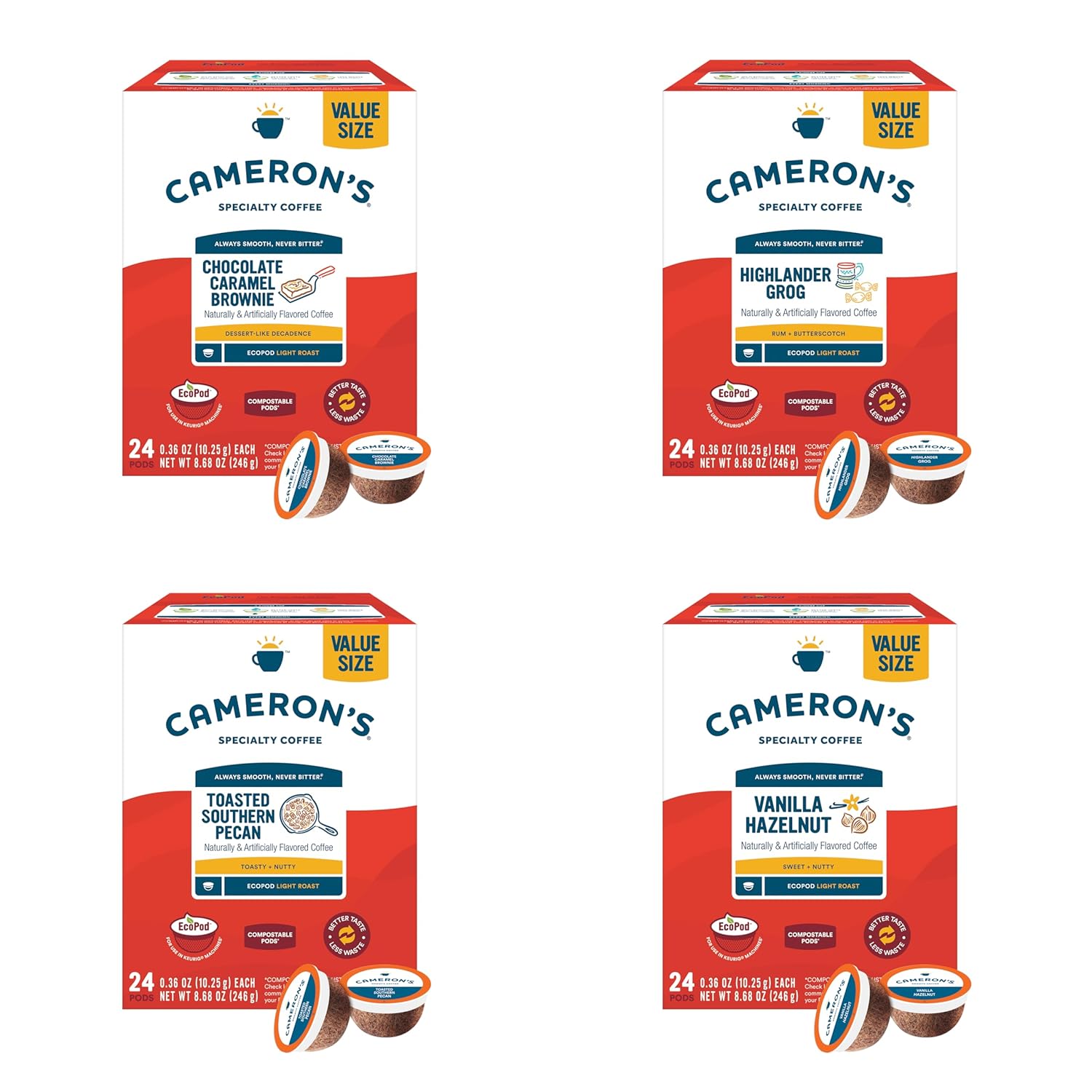 - QUICK AND EASY: Variety Pack of 4 boxes of 24 counts of Vanilla Hazelnut, Highlander Grog, Chocolate Caramel Brownie, and Toasted Southern Pecan single serve, compostable, coffee pods. Cameron's Coffee strives to provide the convenience of a single serve pod with the quality of café brewed coffee