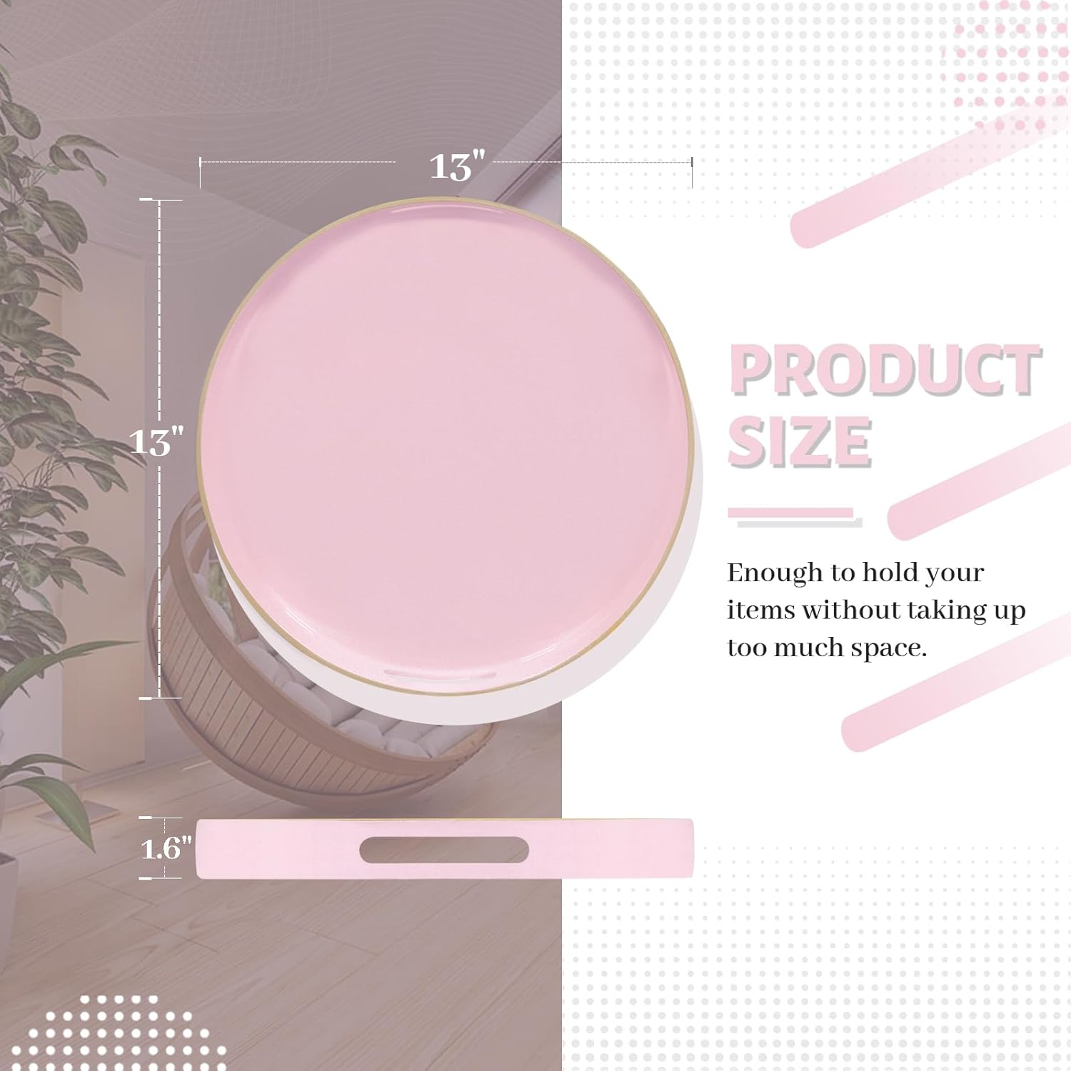 - TRAY DECOR: Pink tray is often used to present food and drinks in an appealing and organized manner. Round table tray can enhance the visual appeal of the items being served, making them more enticing to guests or customers. Also place it on your bathroom vanity as an exquisite showcase for perfumes, jewelry, or bath accessories.