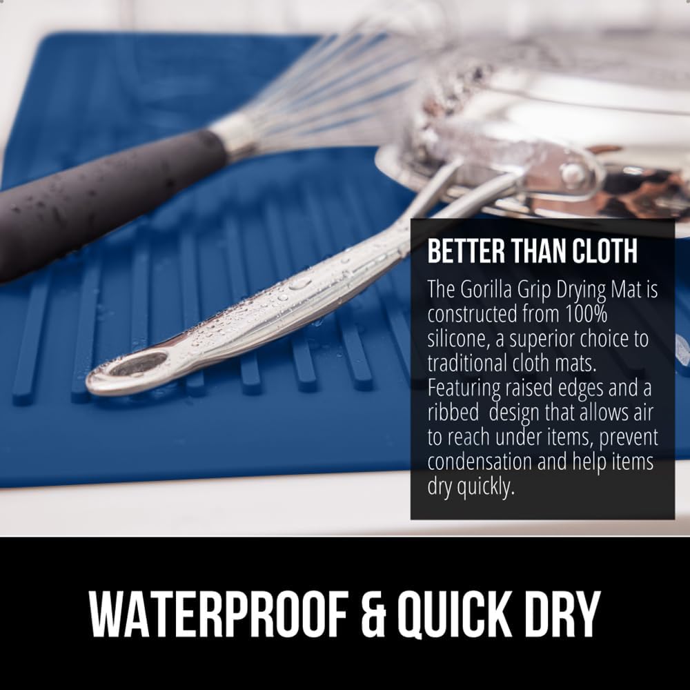 GORILLA GRIP 100% BPA-Free Patented Silicone Dish Drying Mat for Kitchen Counter, 18x16 Inch, Water Catching Ribbed Design, Easy Clean Waterproof Sink Liner, Heat Resistant, Fits Under Rack, Blue