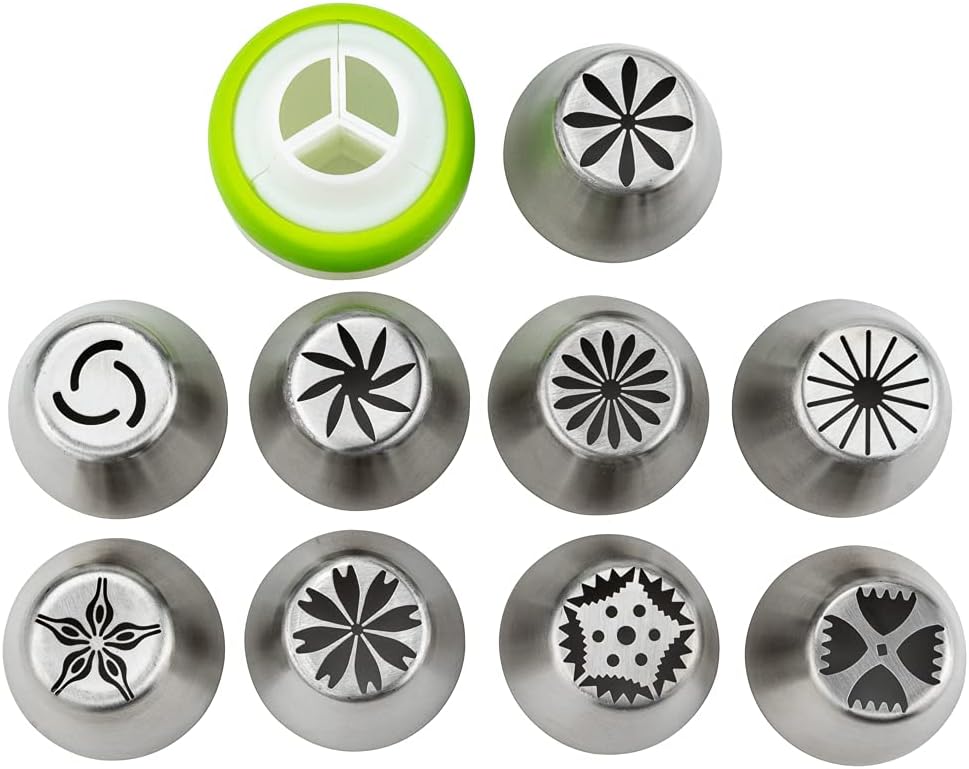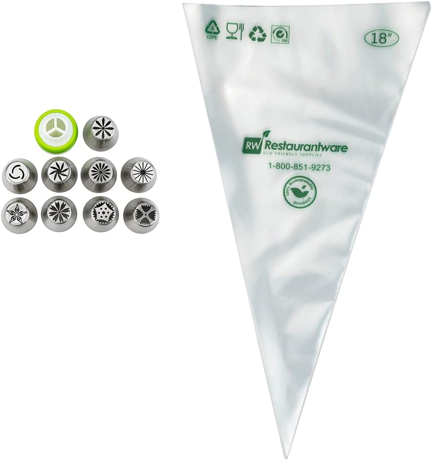 - ALL THE TOOLS YOU NEED TO DECORATE: This piping tip set brings 9 Russian piping tips, 10 piping bags, and 1 tri-color coupler so you can frost a variety of designs and flowers on cakes.