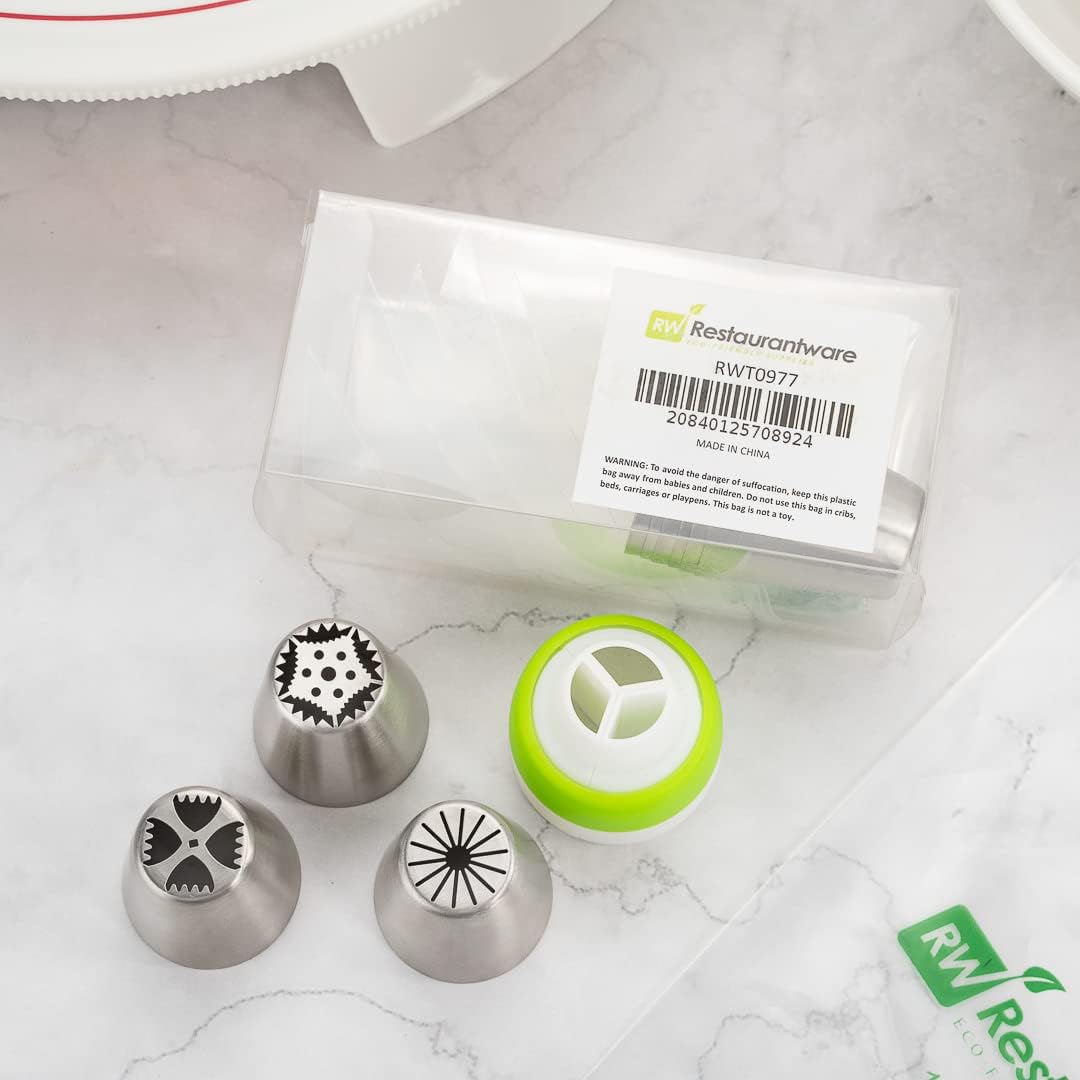 Restaurantware Pastry Tek Russian Piping Tips Set 20 Piece Durable Cake Decorating Kit - 9 Piping Tips 10 Piping Bags Stainless Steel Piping Bags And Tips Set 1 Tri-Color Coupler