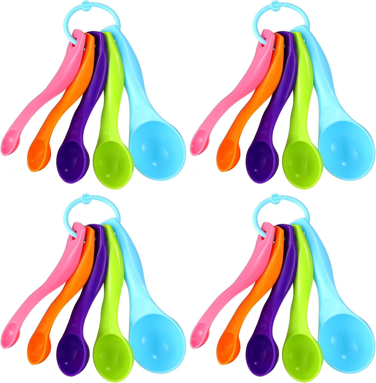 - Measuring Spoons: you will get 4 pack, one pack includes 5 size measuring spoons, total 20 pieces, 1 tablespoon ( 15 ml/ 0.5 ounces ) , 1/ 2 tablespoon ( 7.5 ml/ 0.25 ounces) , 1 teaspoon ( 5 ml/ 0.17 ounces) , 1/ 2 teaspoons ( 2.5 ml/ 0.08 ounces) and 1/ 4 teaspoon ( 1 ml/ 0.03 ounces