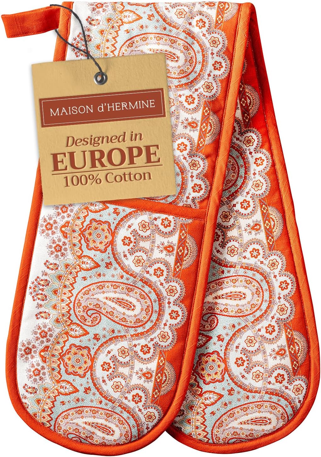 Maison d' Hermine Double Oven Mitts 100% Cotton 7"x35" Double Oven Mitt Heat Resistant BBQ Cooking Gloves with Loop, Baking, Grilling, Home, Kitchen, Handling Hot Pans (Cachemire)