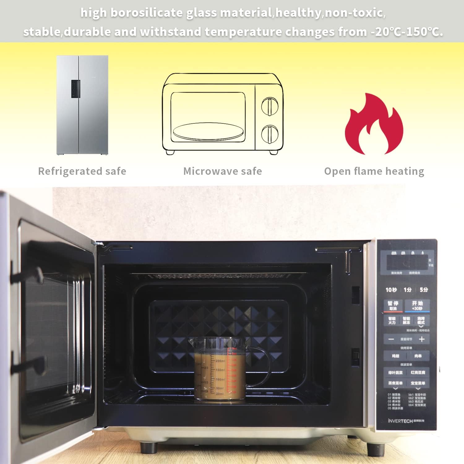 - 250 ML [1 cups]. Made of high borosilicate glass. Suitable for gas stove, microwave oven, electric ceramic stove, oven and refrigerator, not safe in induction cooker