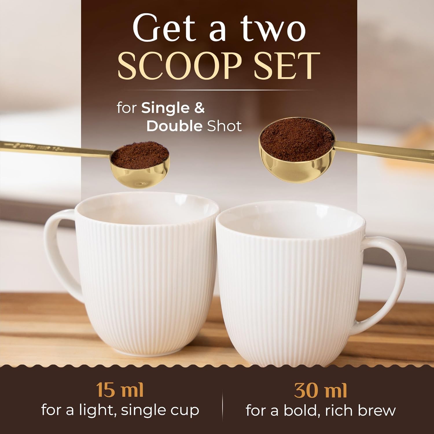 - GET THE RIGHT MIX - Brew the perfect cup of coffee every morning. Our set comes with 1 tbsp (15 ml) and 2 tbsp (30 ml) coffee scoops, so you can get the right amount of coffee every time.