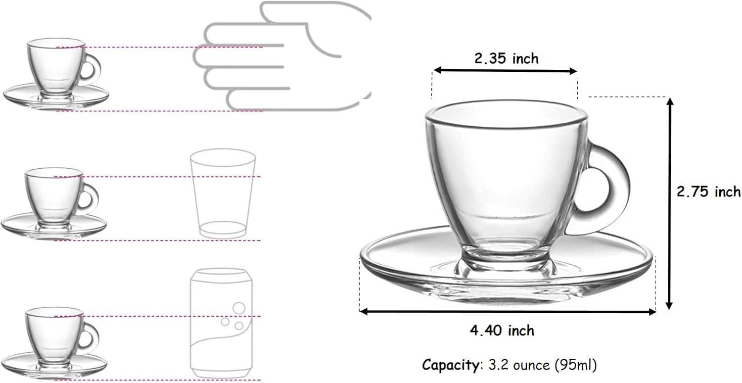 - CAPACITY: A generous volume of 3.2 ounce – 95 ml is sufficient, a perfect choice for espresso, tea, desserts. The glass cups are the perfect size for the espresso drink of your choice; the handle is a comfortable size for transporting your coffee from table to mouth.