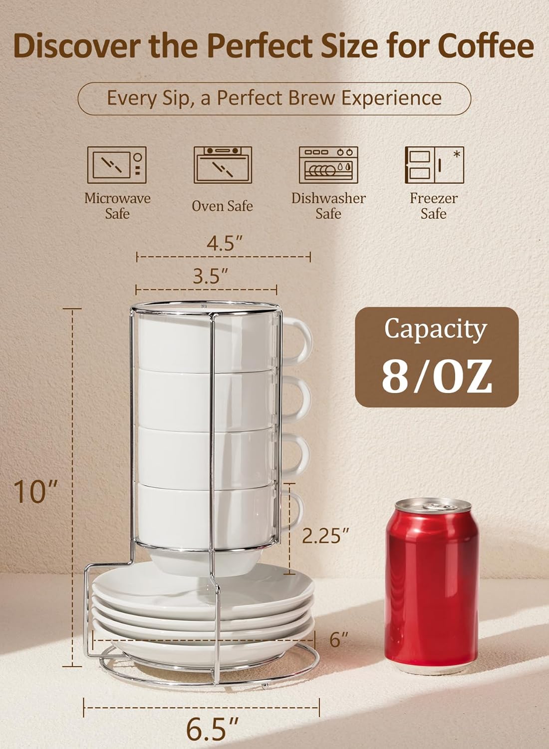 Yedio Porcelain 8 oz Coffee Cups with Saucers and Metal Stand, Porcelain Stackable Cappuccino Cups with Metal Stand, White, Set of 4