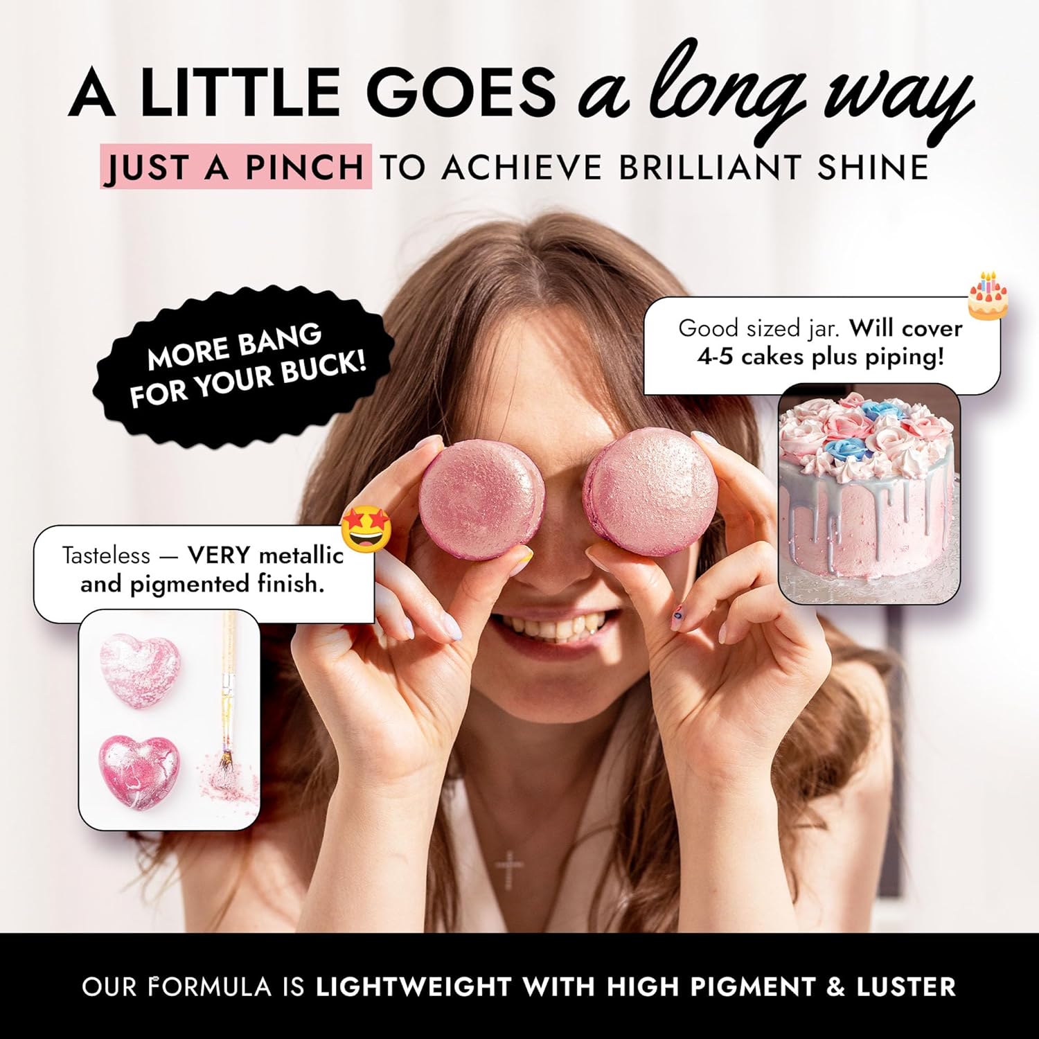 - EASY TO USE: Our pink luster dust is incredibly versatile. Apply with a wet brush, airbrush, or dry brush, and even mix into beverages. Achieve professional-looking results effortlessly at home, whether decorating cakes or adding shimmer to cocktails.