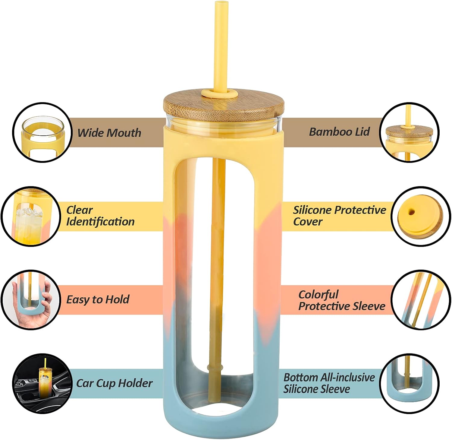 - MADE OF FOOD GRADE SILICONE: Glass cup with lid and straw features with nonslip silicone sleeve, which is a non-toxic material that does not contain any chemical fillers or byproducts, making it safe for use. The 20 oz Glass Tumbler is 2.9"- 7.4", which can fit in most car cup holders. With a wide mouth slot, you can easily put coffee powder,ice cubes,fruit,smoothies etc. which is also easier to clean