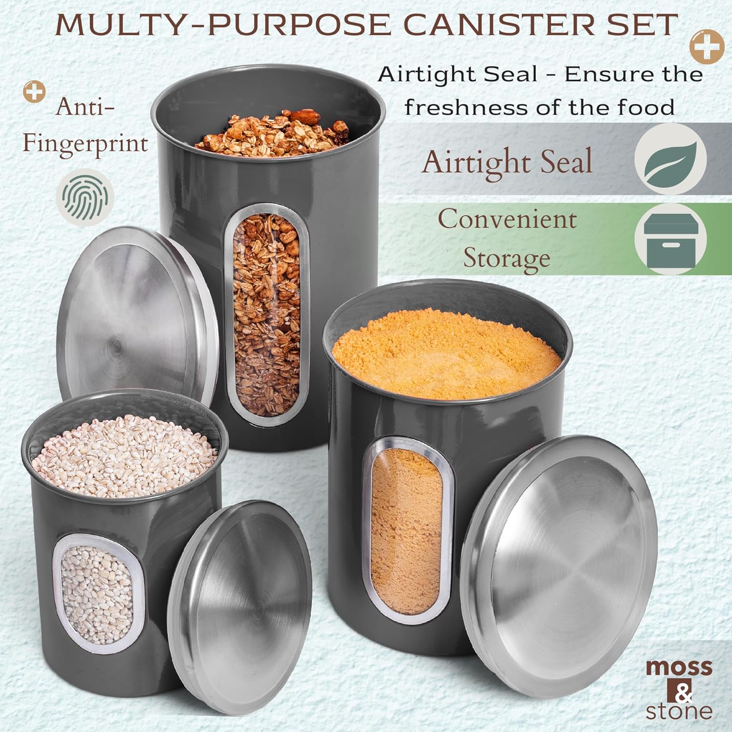 Moss & Stone 3-Piece Gray Canisters Sets For The Kitchen, Airtight Canister Set With See Through Window, Storage Jars for Coffee Container, Tea Organizer & Sugar Canister, Gray Kitchen Canisters