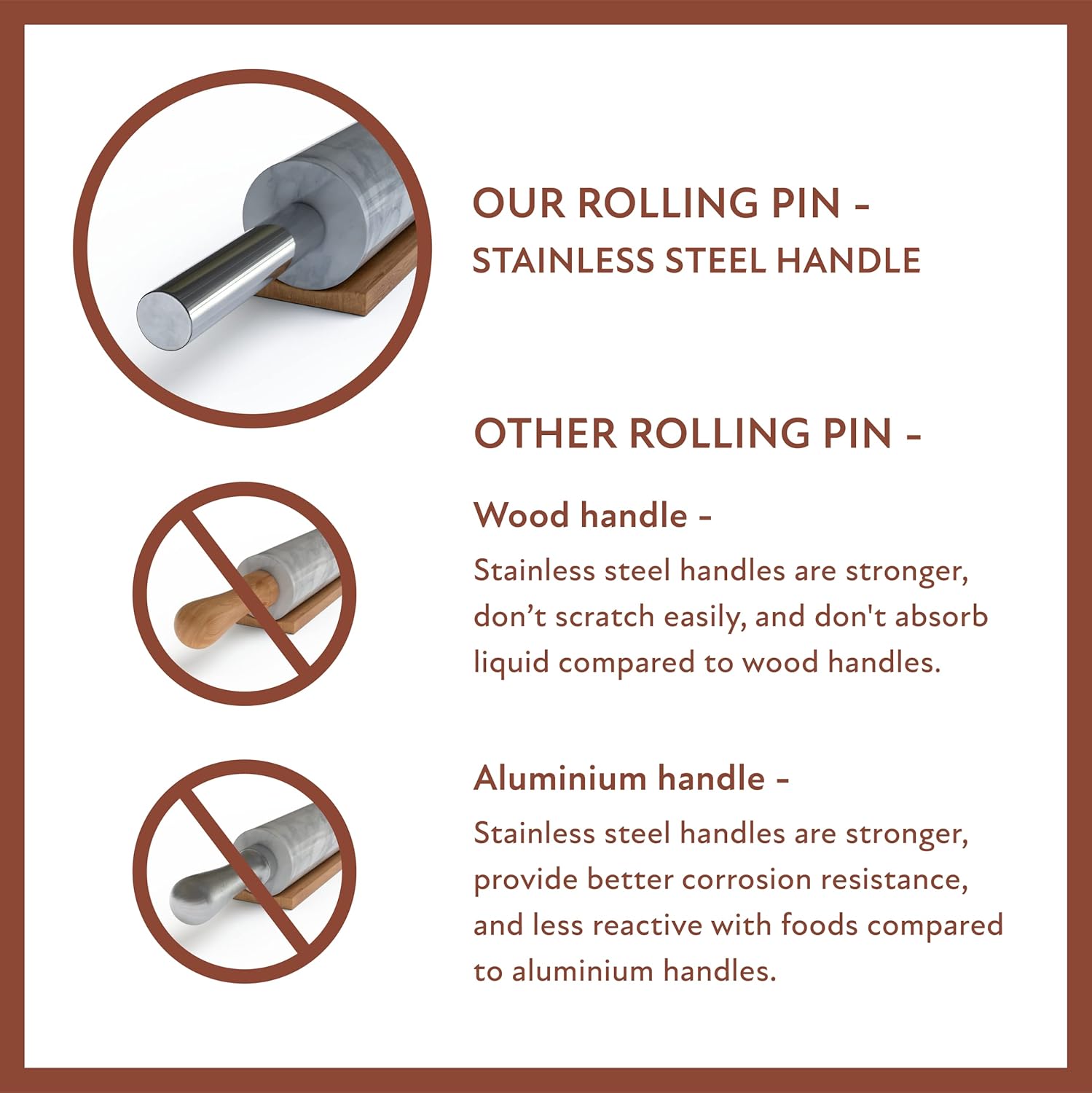 - ✔️ MEASUREMENTS: The total length of the Marble Rolling Pin for Baking with stainless steel handles is 17.7 inch. each handle is 3.9 inch, The Marble Roller is 10 inch long and 2.3 inch diameter which is big and heavy compare to others.